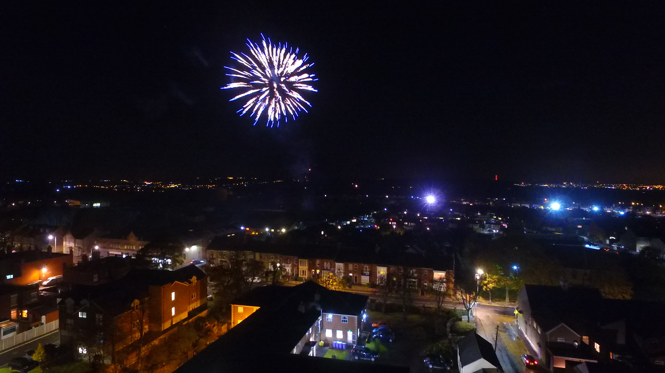 Fireworks didn’t turn out as I had planned. when I got to the local display I had not taken into account the amount of people who would be there. I didn’t want to fly over the crowd so it was just basically up and stay there from just outside the park. On a positive note I learned a thing or two I realised that 1. I need some cree for night flights. 2. the drone does a half decent job hand held.