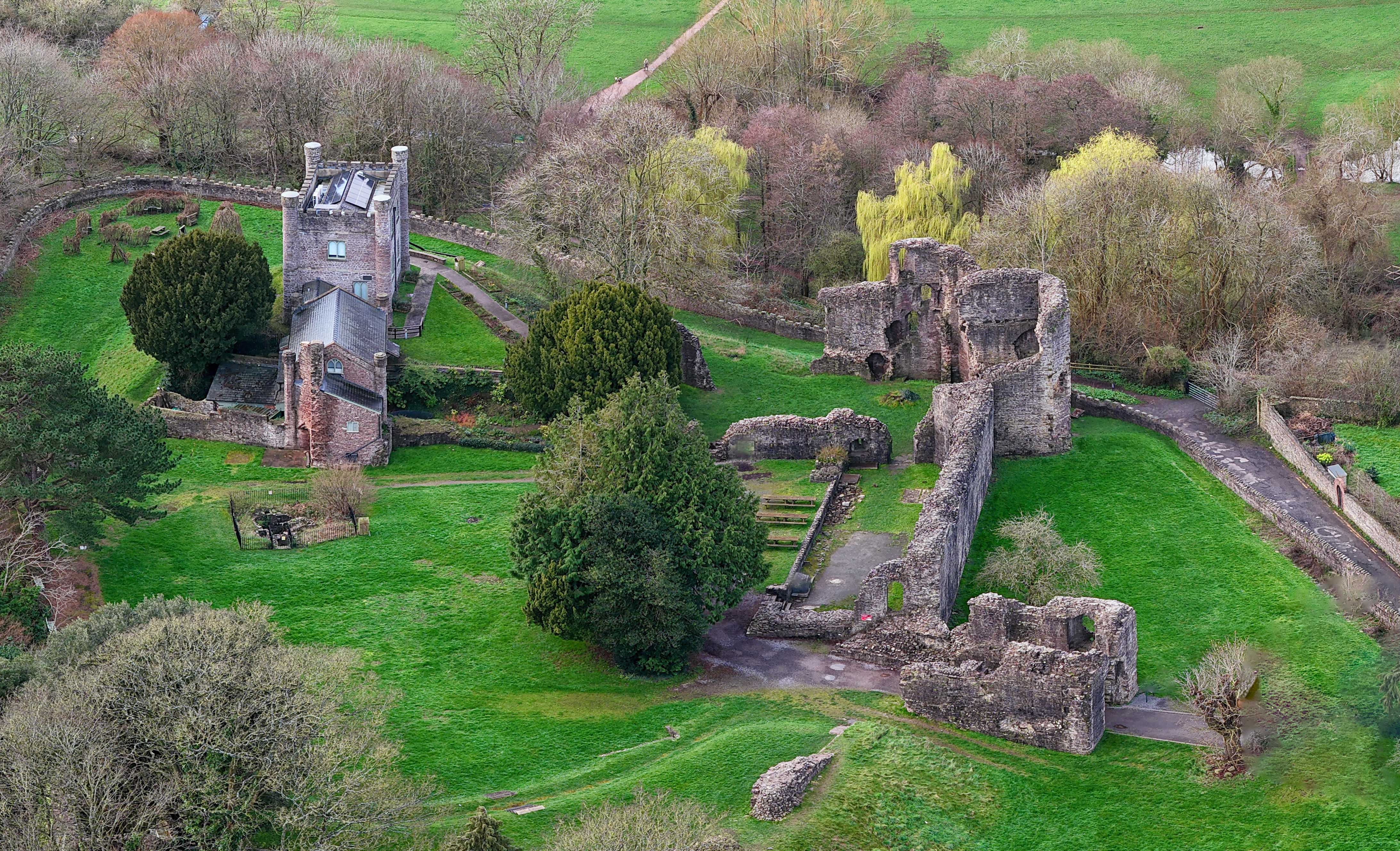 River Usk with bridges, large green fields in valleys surrounded by several mountains (Sugar Loaf, Skirrid, Blorenge etc).