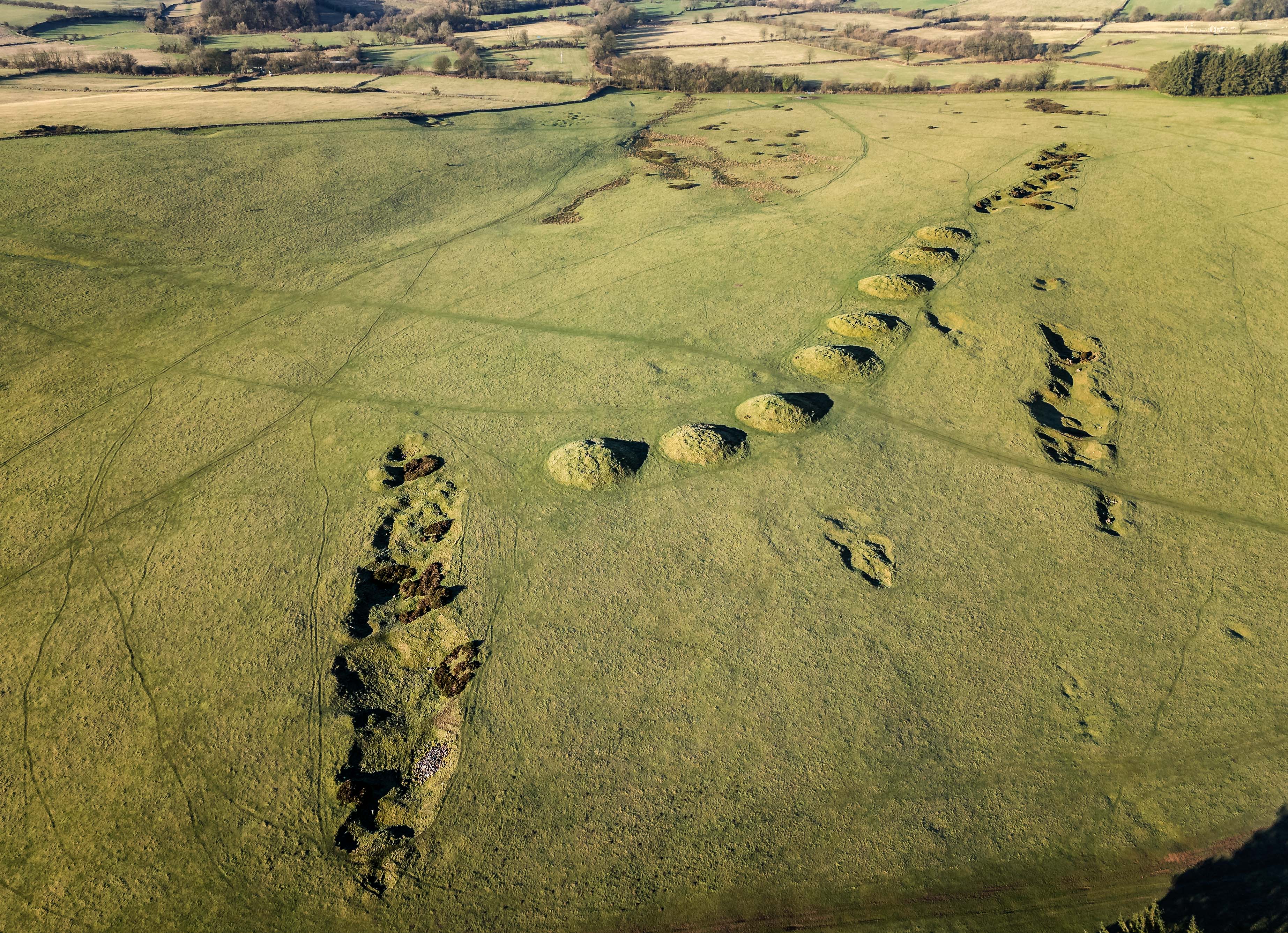 The aerial photograph reveals this prehistoric design. From above, the barrows appear as rhythmic humps casting subtle shadows, their alignment cutting diagonally across the pasture. The low winter light enhances their form, allowing the ancient geometry of the cemetery to emerge clearly against the modern agricultural landscape