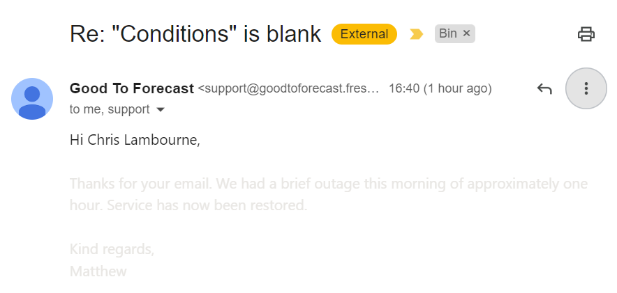 Thanks for your email. We had a brief outage this morning of approximately one hour.