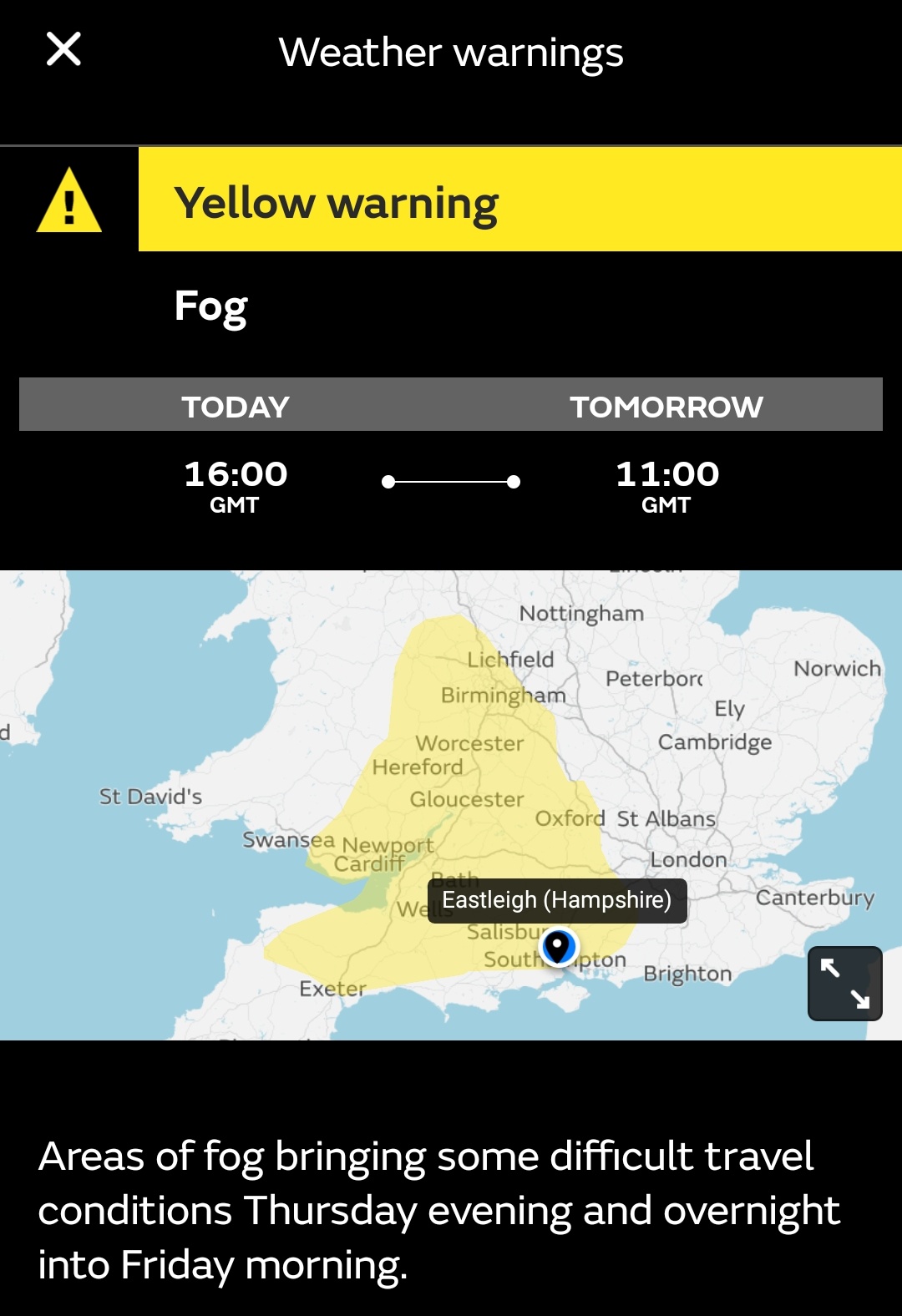 BBC Countryfile weather forecast - “Colder / dryer - clearer skies and possible drone flying misty/foggy patches.” ![]()