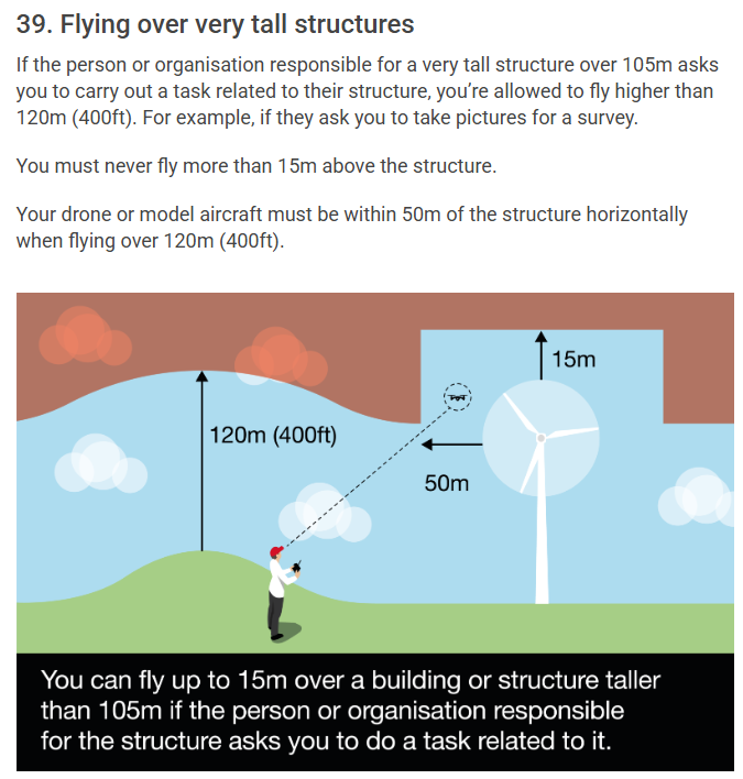You can fly up to 15m over a building or structure taller than 105m if the person or organisation responsible for the structure asks you to do a task related to it