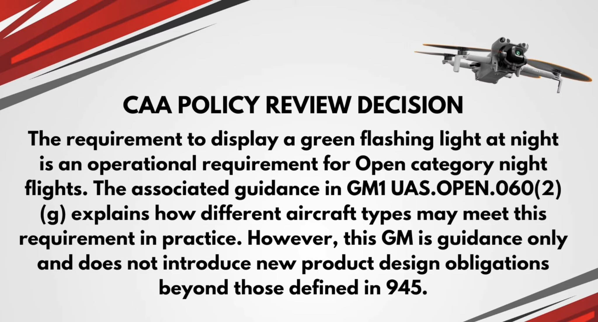 Unmanned Support (run by Graham Degg) and Geeksvana have had it confirmed from the CAA that the GUIDANCE of the green flashing light for flying at night does not require an external lighting module to be affixed to the drone. They are happy with the fact the drone will, at some point during the flight, have green flashing lights.
