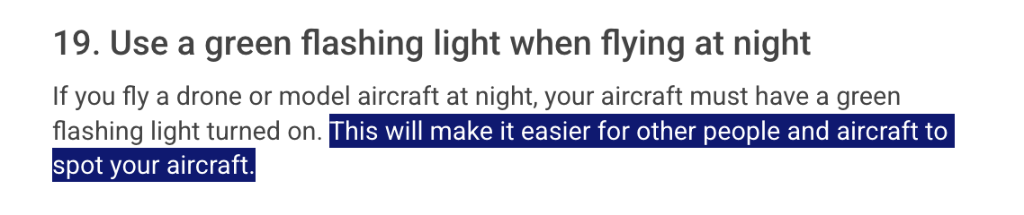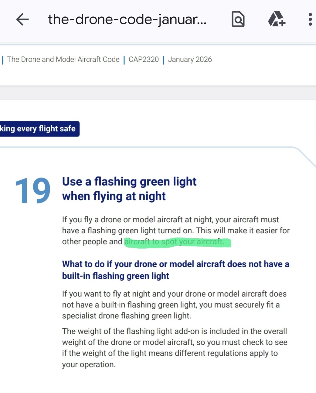I know what the drone code says, but, our trade body Unmanned Support has on many occasions confirmed that the green flashing light has absolutely nothing to do with aircraft.