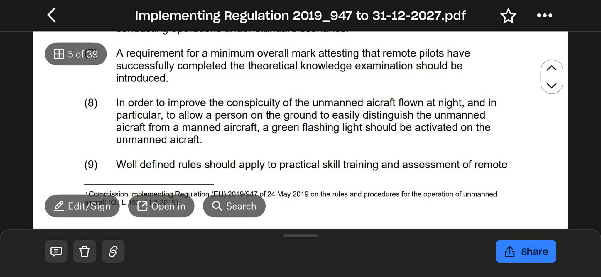 Under Commission Implementing Regulation (EU) 2019/947 (and the UK equivalent), a flashing green light is mandatory for drones operating at night to distinguish them from manned aircraft. This requirement is to enhance safety and conspicuity, allowing ground observers to identify the aircraft as a drone.