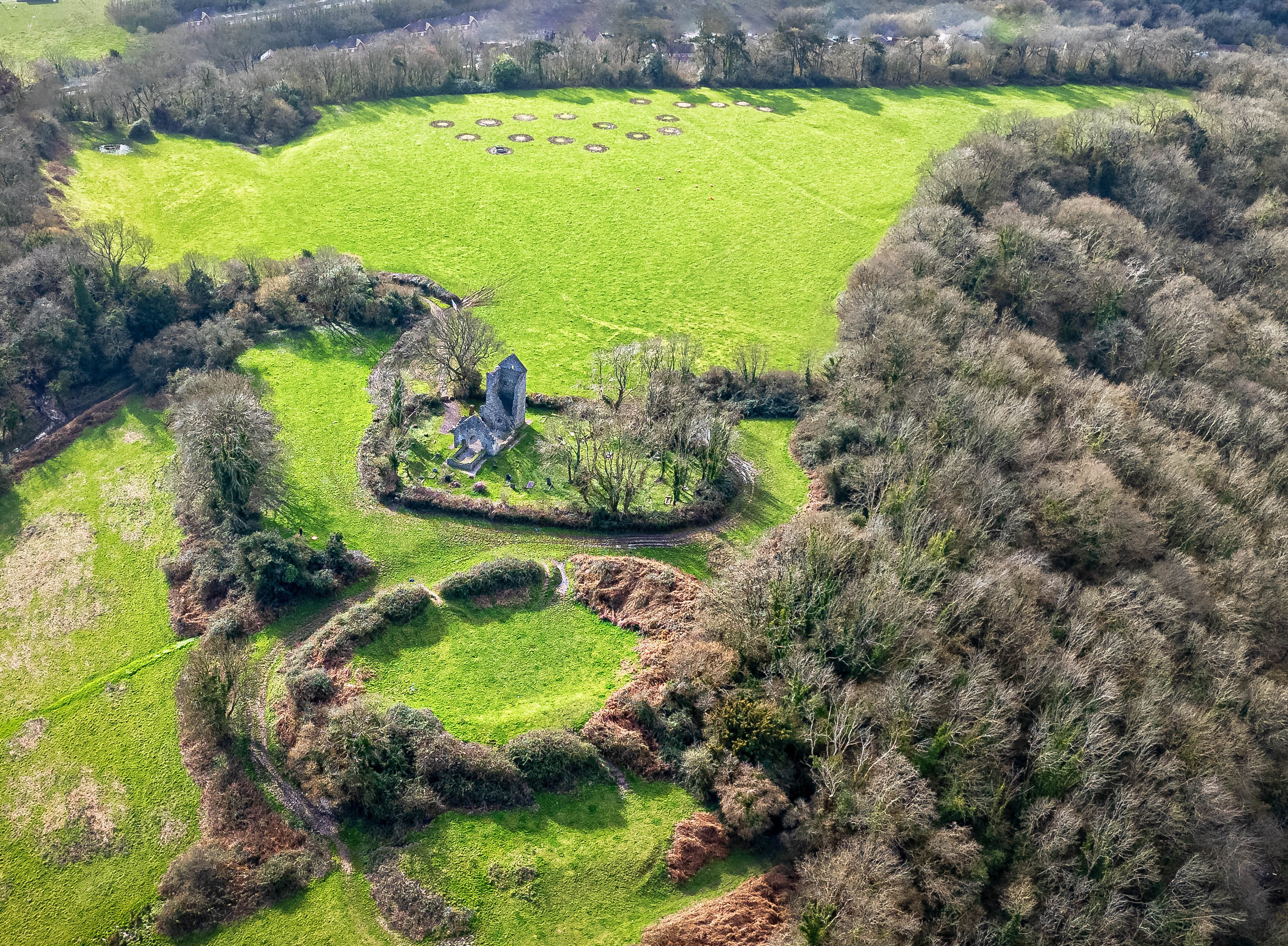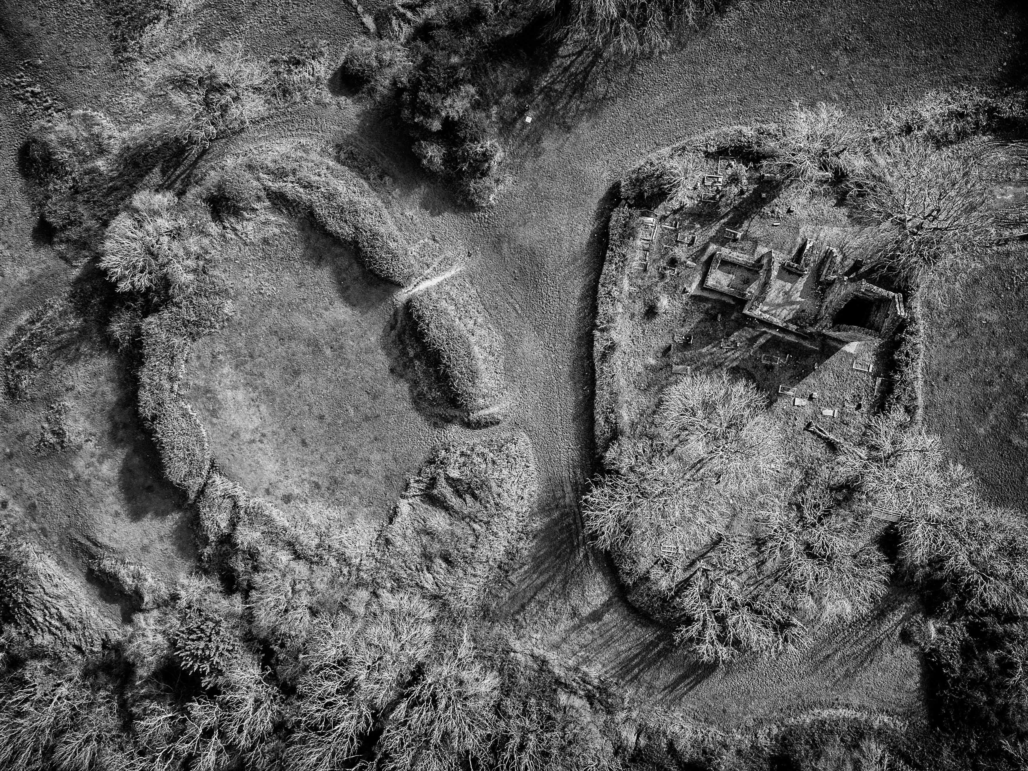 The hillfort is one of the largest and most significant Iron Age sites in South Wales, originally a stronghold of the Silures tribe. The overall site covers an area over 5 hectares – larger than 4 full size football pitches. Its multiple ramparts and ditches, clearly legible in the aerial photographs, enclose a strategic plateau overlooking the Ely Valley. The sweeping curves of earthworks visible from above reveal successive phases of construction, reflecting the site’s long occupation and defensive importance within pre-Roman tribal territories
