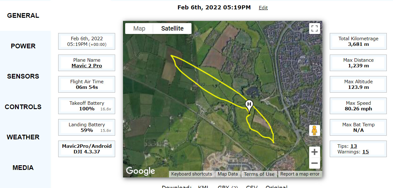 What the data doesn’t show (surprisingly) is that the camera was pointing down from about a minute into the flight. When I tried to use the rotating wheel on the top left of the controller (or the touch screen slider) it just randomly shook all over the place erratically! And my view down was near enough pitch black at 5.20pm. I flew the rest of the way using the map. Was late switching out of Atti mode and overshot the home point by about 400m