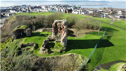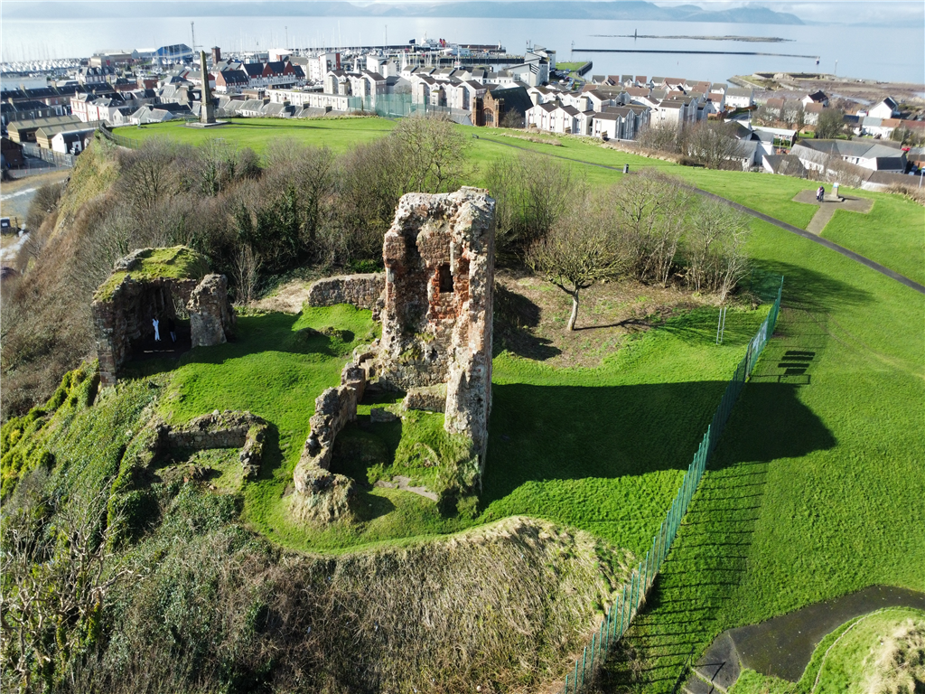 Large open area with views of Ardrossan coastline and the old ardrossan castle and monuments.