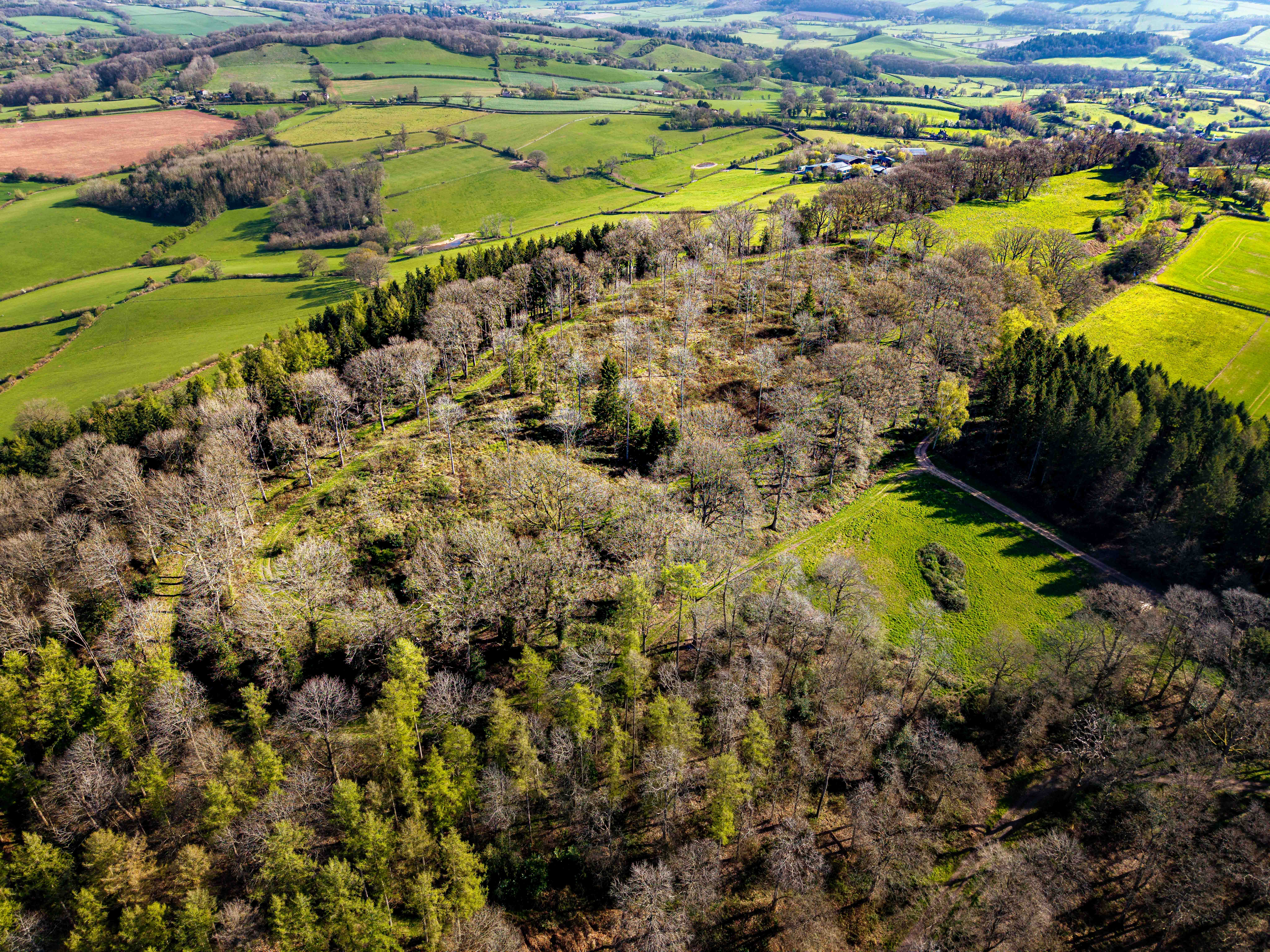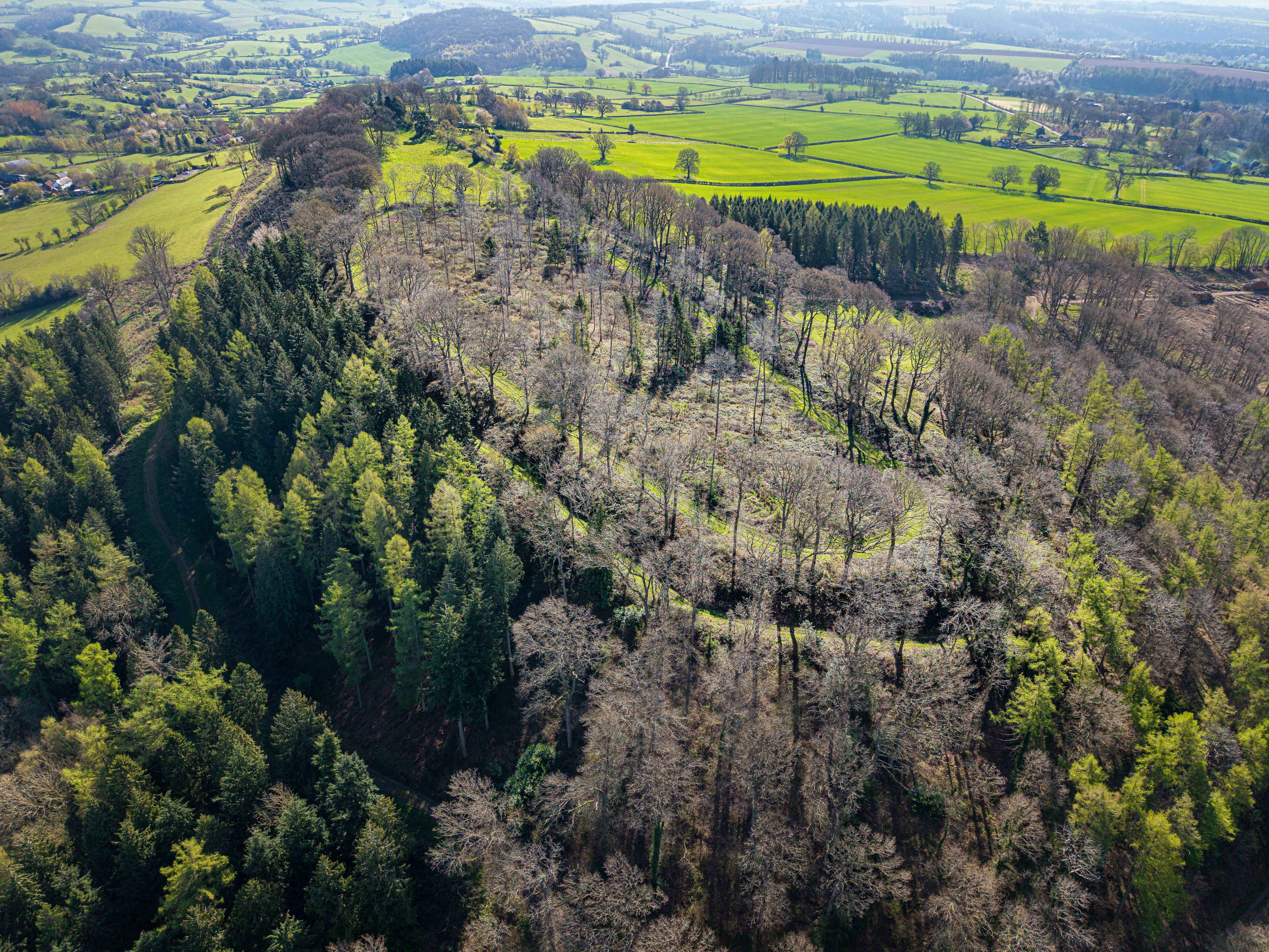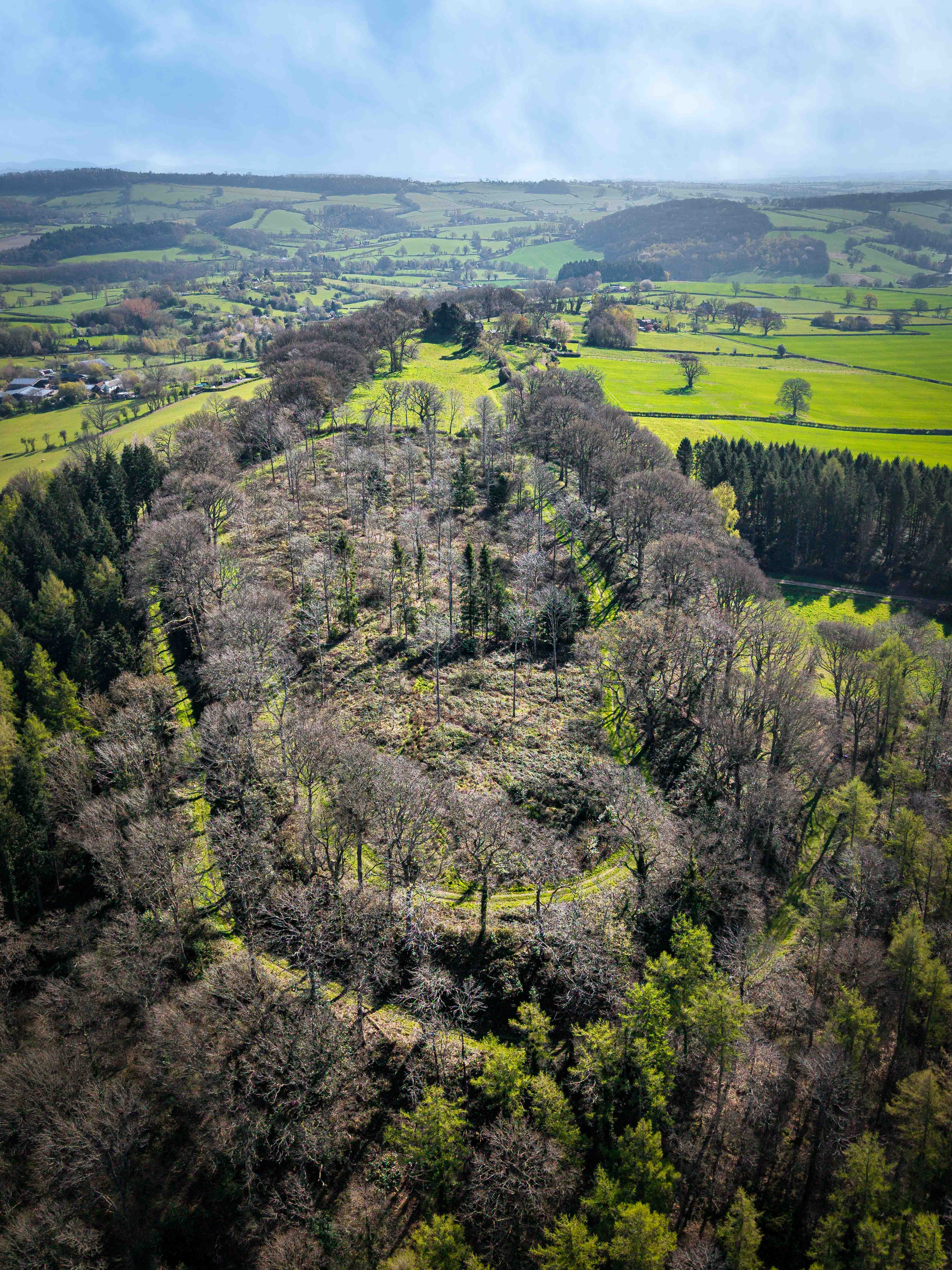 In the top-down perspective the double banks and ditches on the northern side remain well-defined. Even under the canopy of trees, the "V-shaped" profile of the ditches is still visible, showing the massive amount of earth shifted by prehistoric hands.