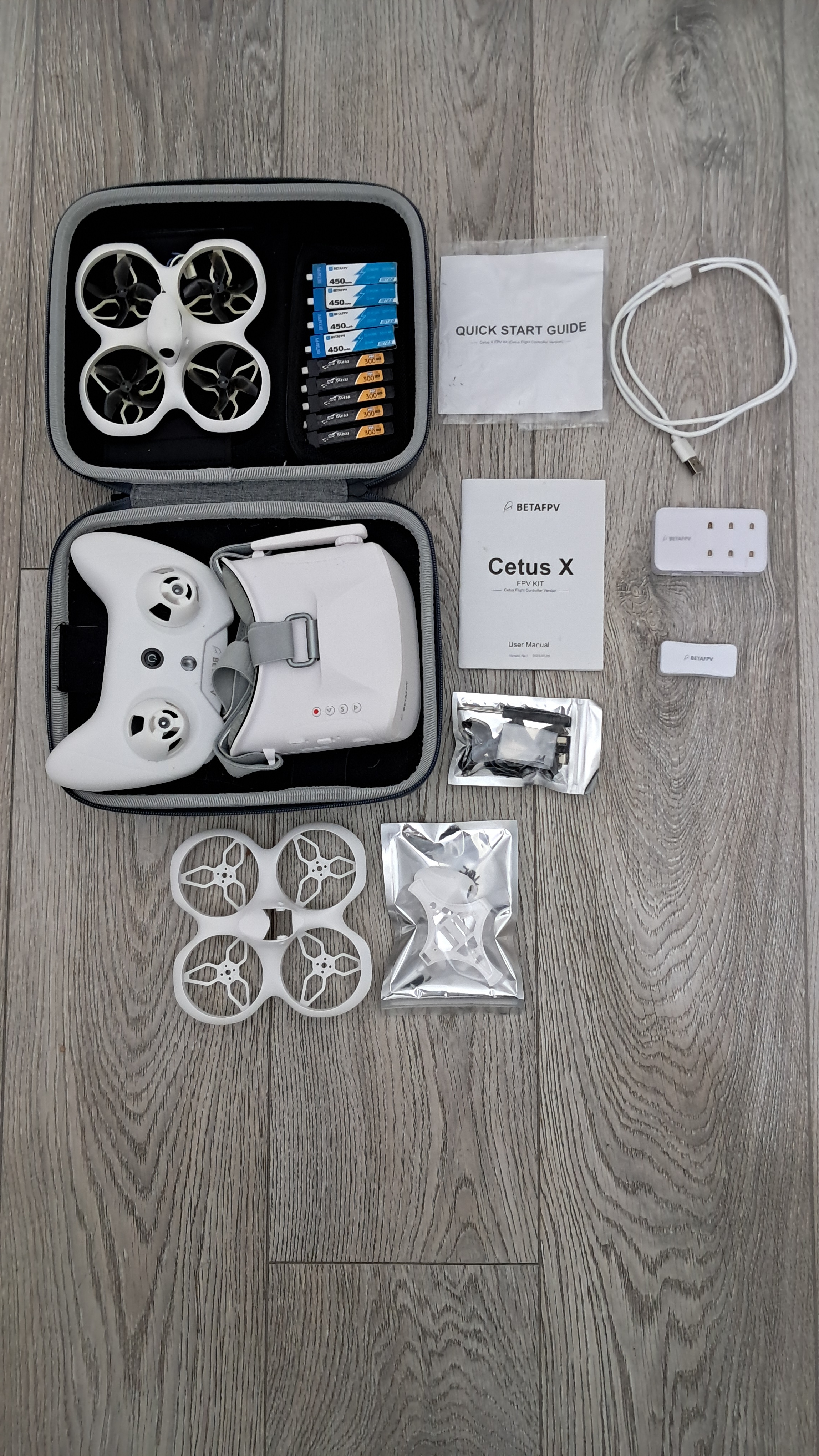 Included in the the FPV kit are the Cetus X Whoop, goggles, controller, manuals and hard box/bag
