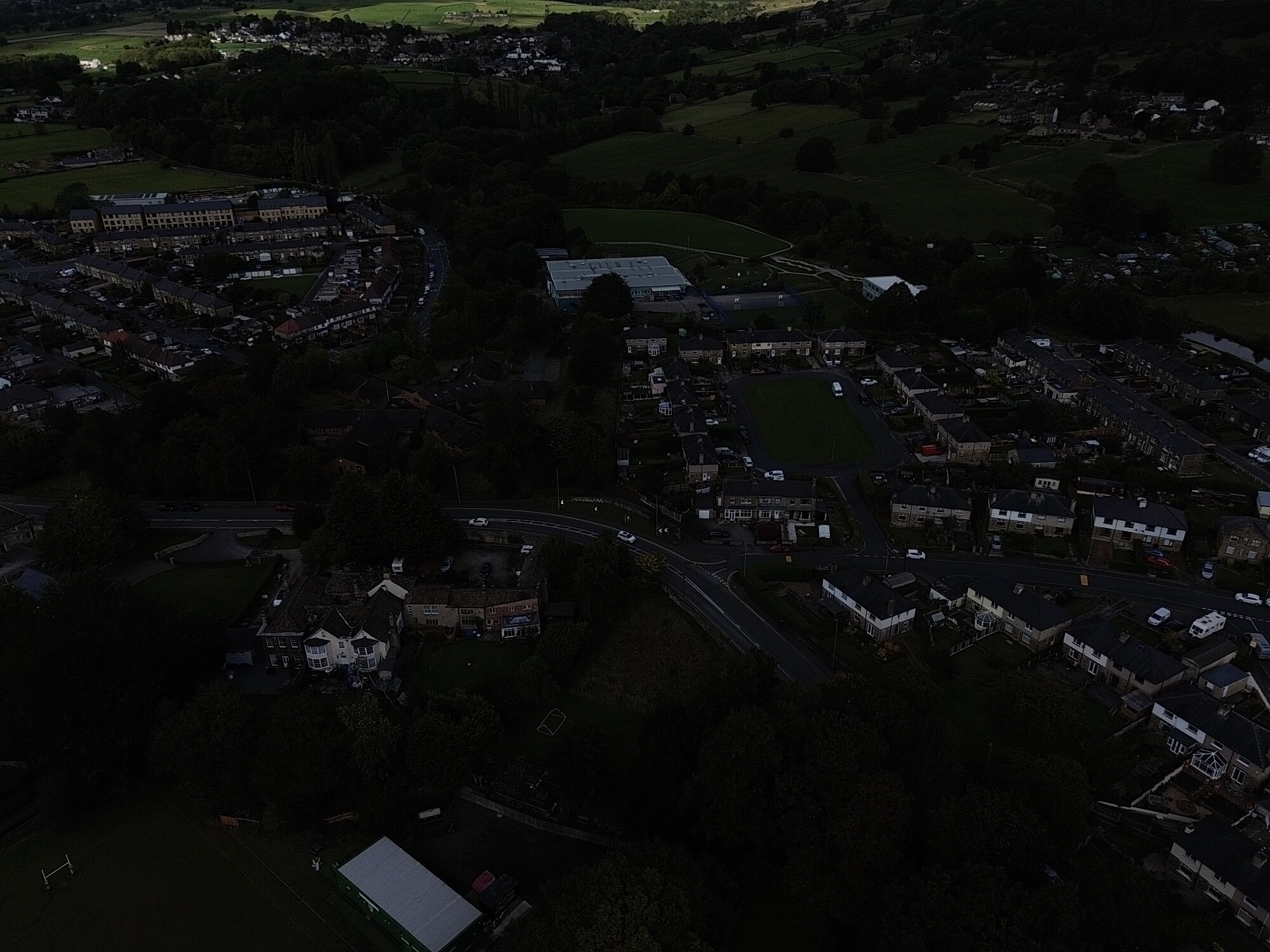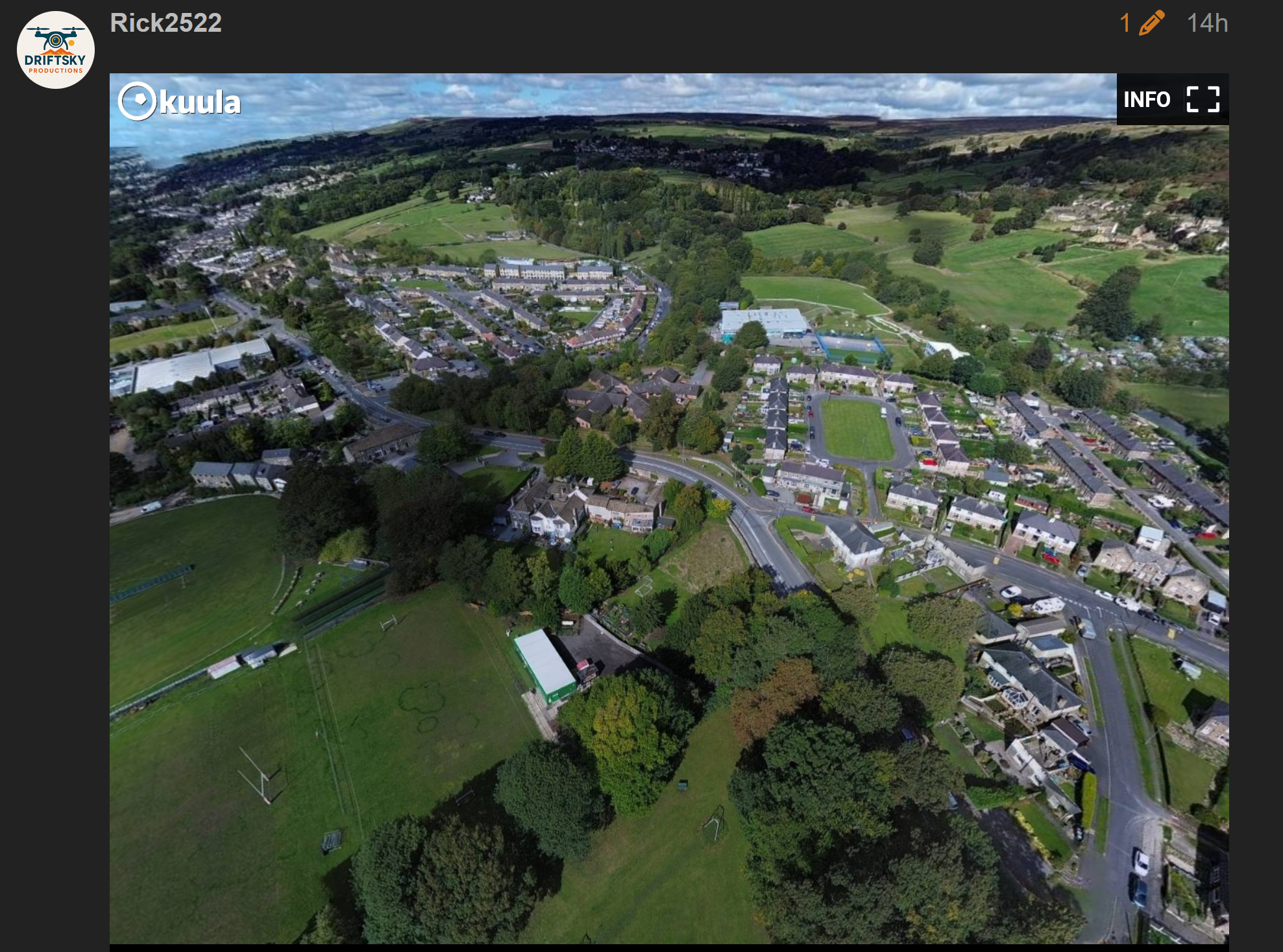 This 360° drone panorama captures Crossflatts, a peaceful village nestled in the Aire Valley, between Bingley and Keighley in West Yorkshire. From above, you can see the Leeds and Liverpool Canal winding gently alongside rows of traditional stone houses and modern family homes, with the green hills of the Yorkshire countryside stretching out on all sides.