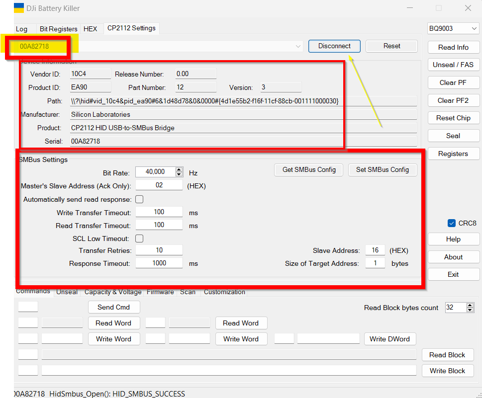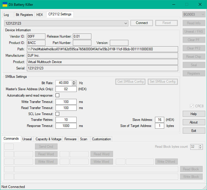Howdy! I have my DJI Mavic 1 battery connected to CP2112 and usb connected to my laptop. Clicking the “Connect” button gives me: ERROR: Could not open device. I triple checked all contacts etc.