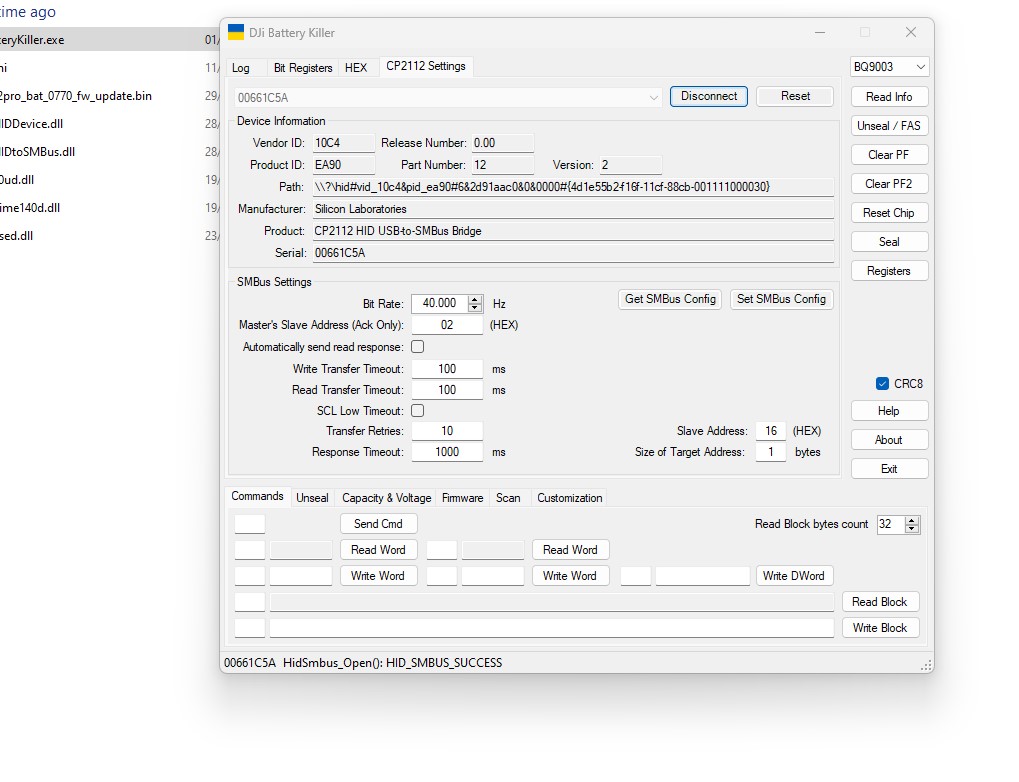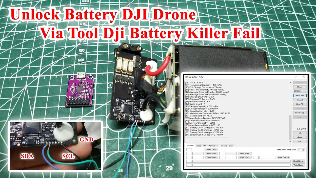 I have a Mavic DJI Pro (1) that I bought in 2018, and I’ve only used it about 3 or 4 times. Recently, when I tried to charge the batteries, they all started blinking with a single light and then stopped. After doing a lot of research, I decided to buy the CP2112 debugging board and attempted to use the DJI Killer battery. I managed to connect to the debugging board, but whenever I connect the GRD, SDA, and SCL pins to the battery, I encounter the following error: