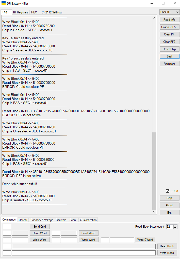 I have the software up and working and it can read, unseal, reset chip, and seal but it cannot clear PF or Clear PF2. Any ideas?