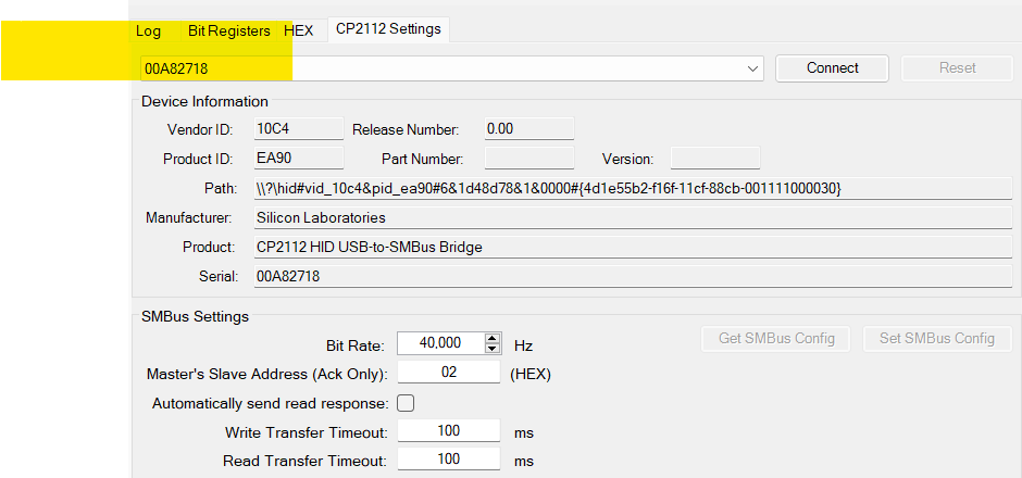 in CP2112 Settings I got something like 00EC19ED (not always, I have to plug in and out the USB cable 2-3 times in my CP2112 board). But when I click on “Connect” nothing happens. I’m using WIN 11, what could it be ?