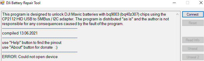 Good evening. I own a DJI Mavic Air (1) and after not using the batteries for a year they don’t even charge. I have bought the CP2112 and connected it to the batteries. My problem is that though I connect de cp2112 via micro-usb to my laptop when I use DJI Battery Killer compilation 13.6.21 it answers a message “ERROR: Could not open device”.
