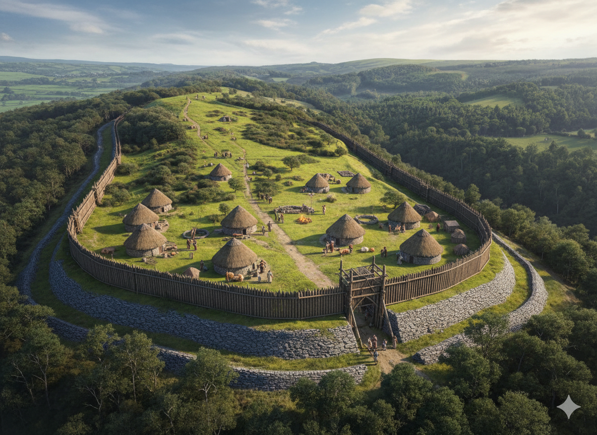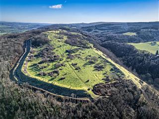 Today, the site is a National Trust-owned SSSI, where the thin limestone soils support rare wildflowers and butterflies. The low-angled sunlight in the photo highlights the single and double earth banks, showing why this is still one of the best-preserved hillforts in South West England.