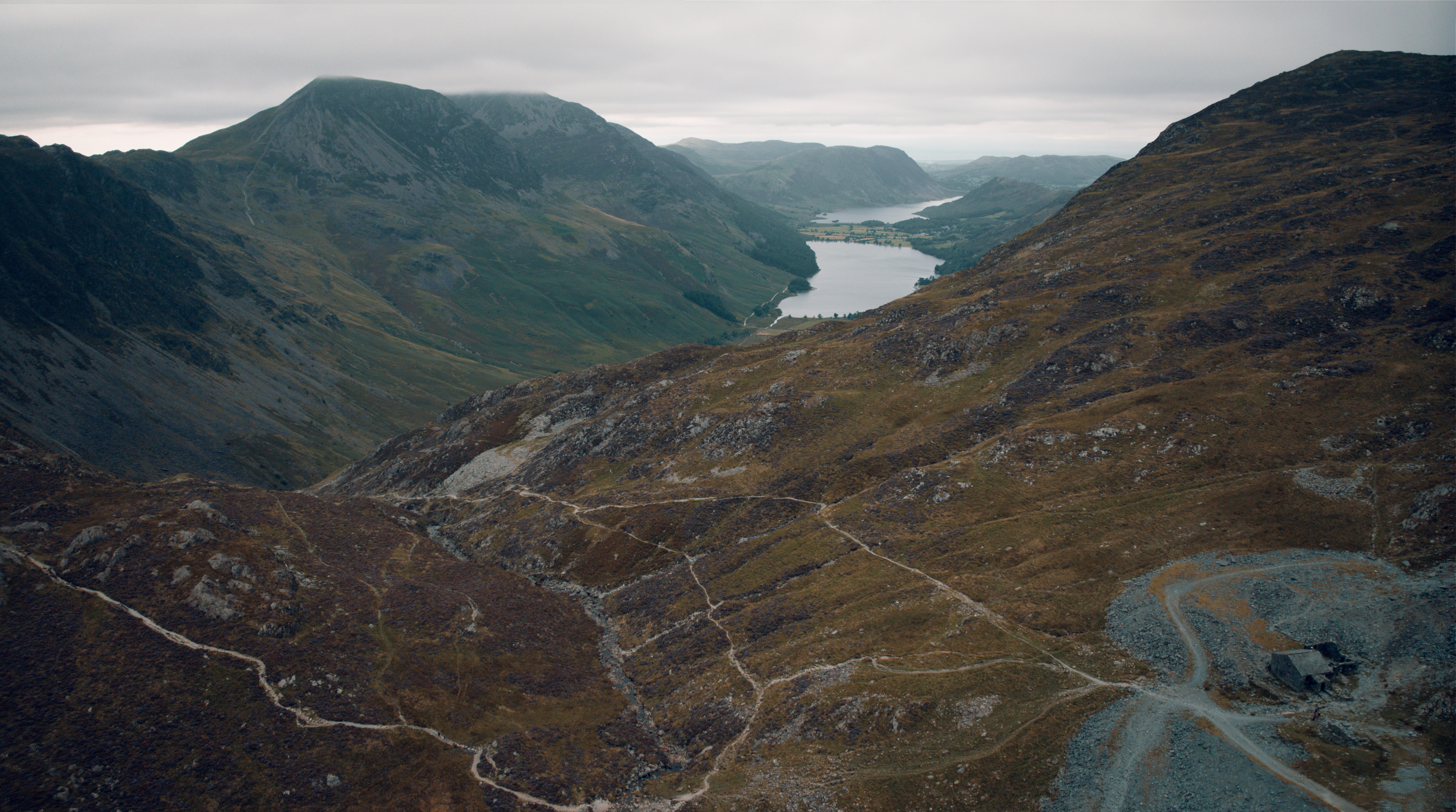 flying around dubs hut between buttermere and honister slate mine
