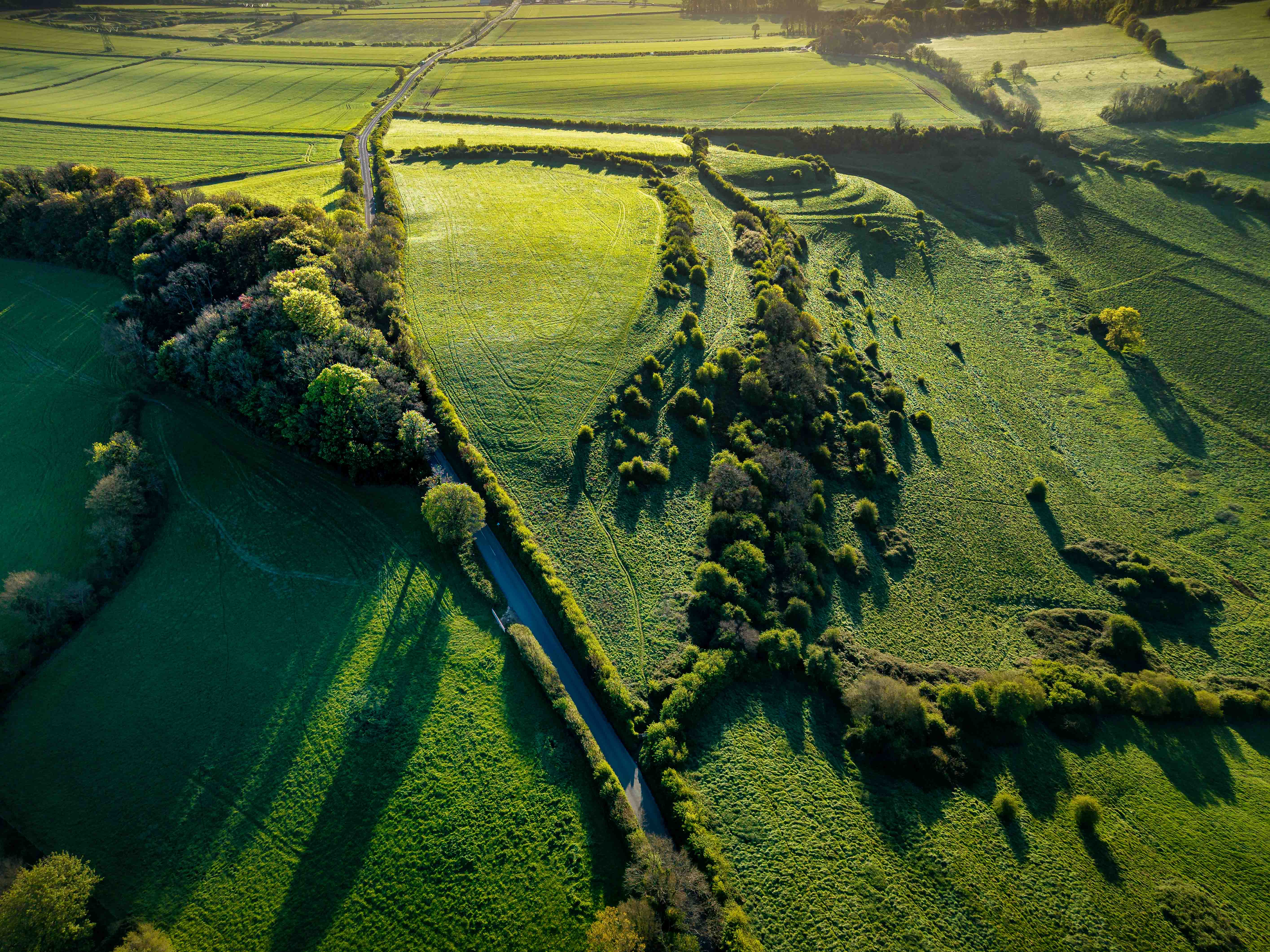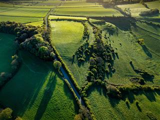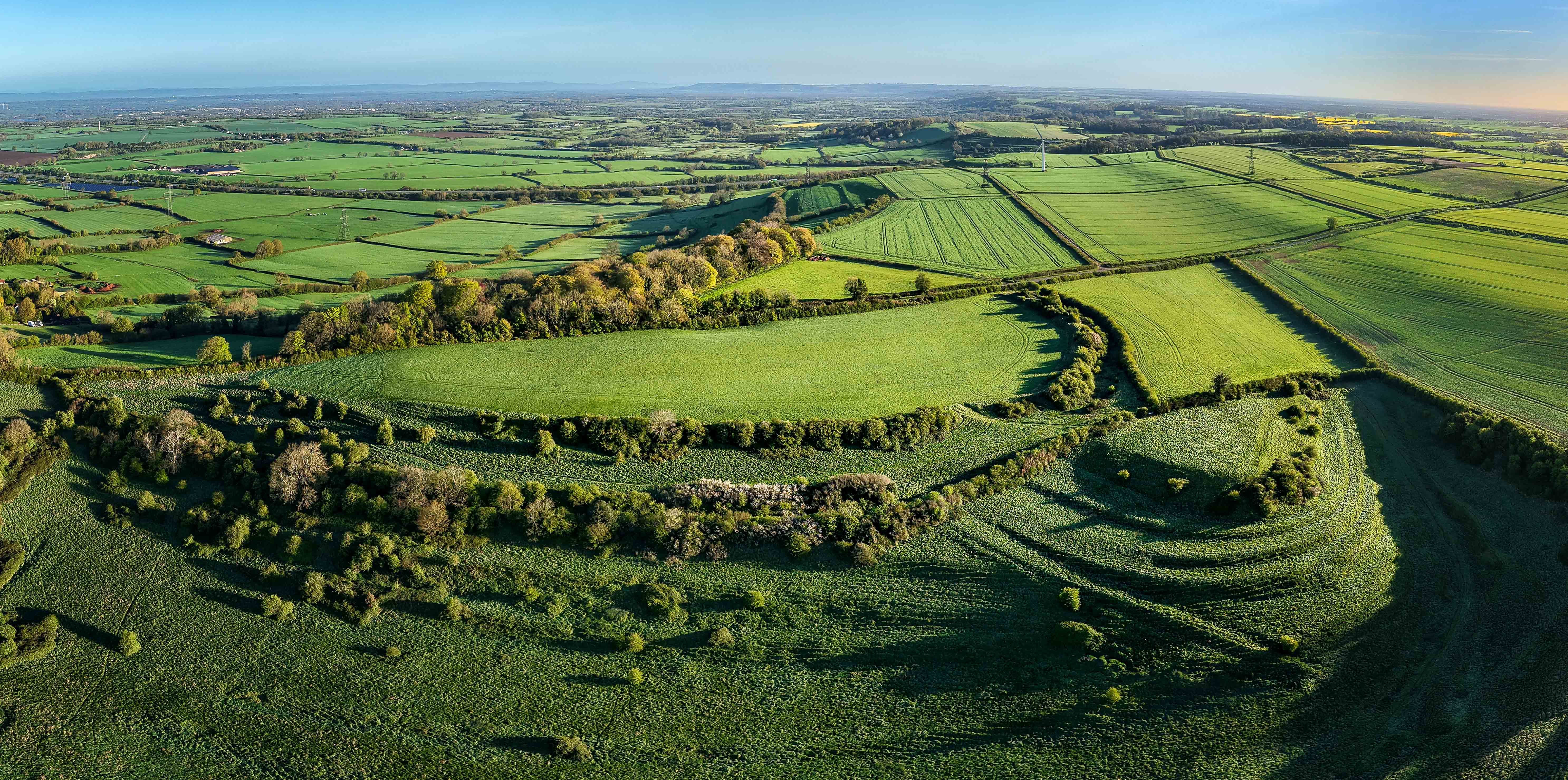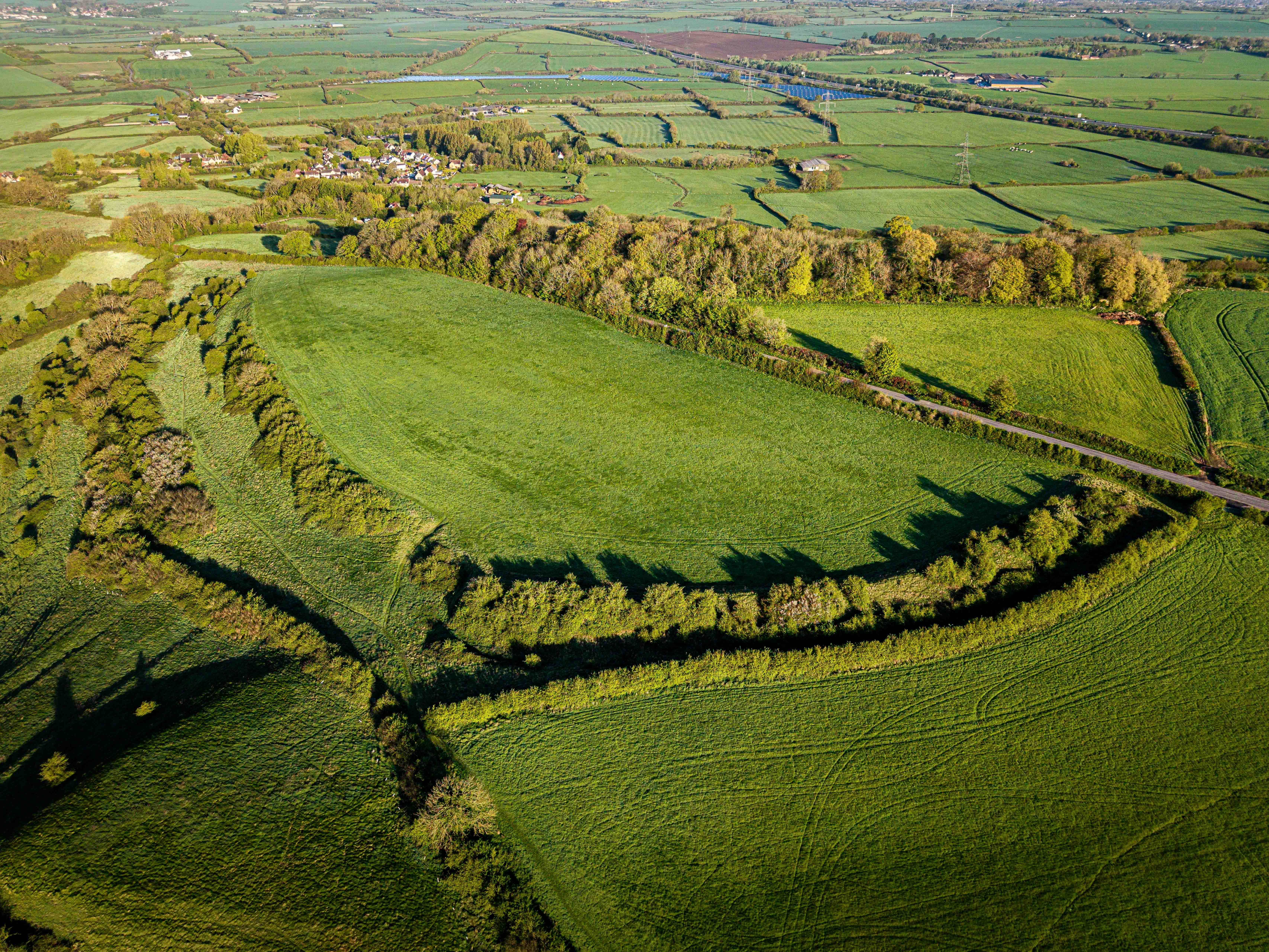 These aerial perspectives offer a striking masterclass in Iron Age engineering and the strategic use of topography. Hinton Hill Fort (also known as Dyrham Camp) occupies a commanding 240-meter limestone spur of the Cotswold Edge in Gloucestershire. Its primary defensive feature—a massive, single ditch and bank—is most visible where the low morning sun casts deep shadows that emphasise the surviving earthworks.
