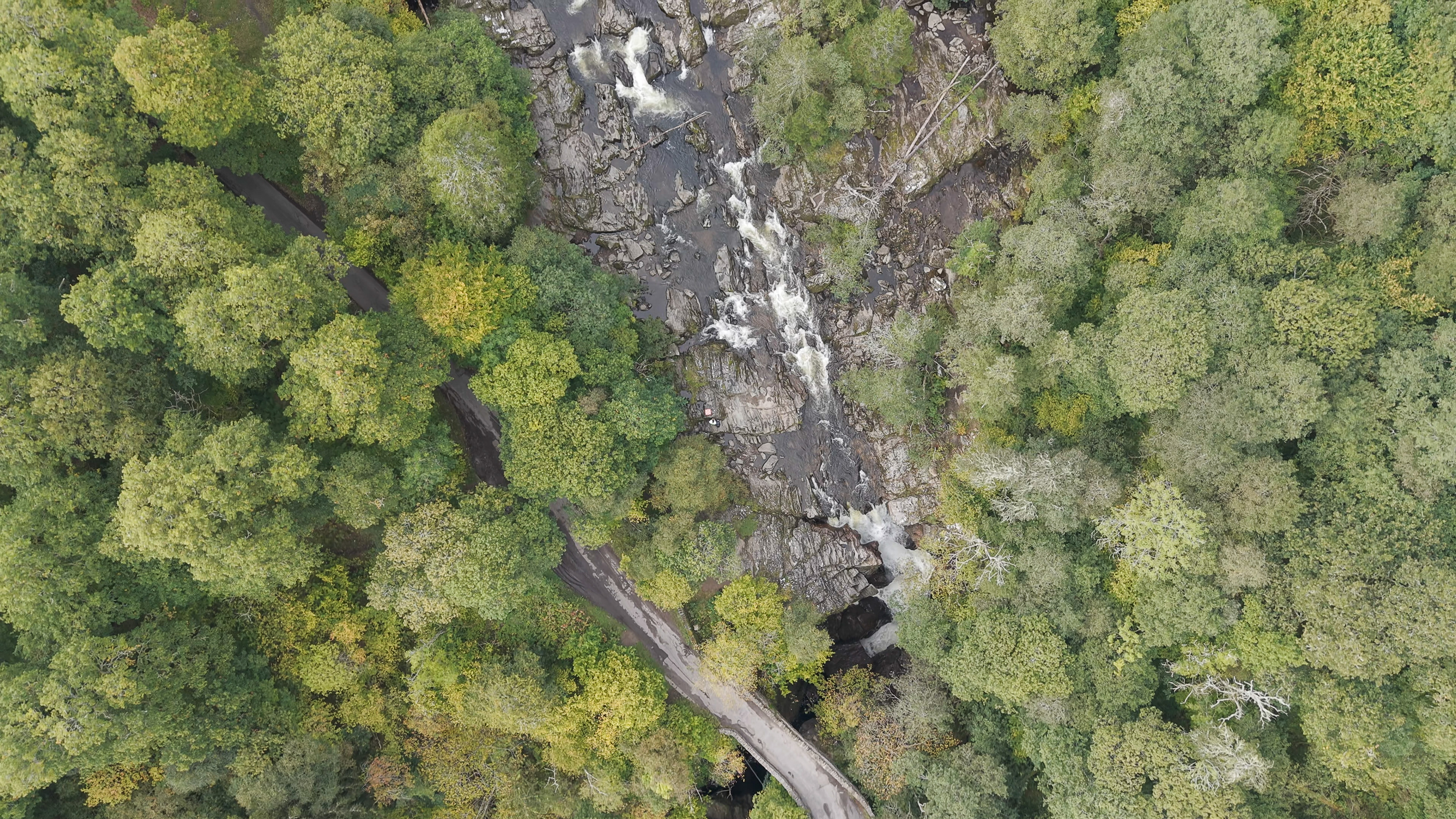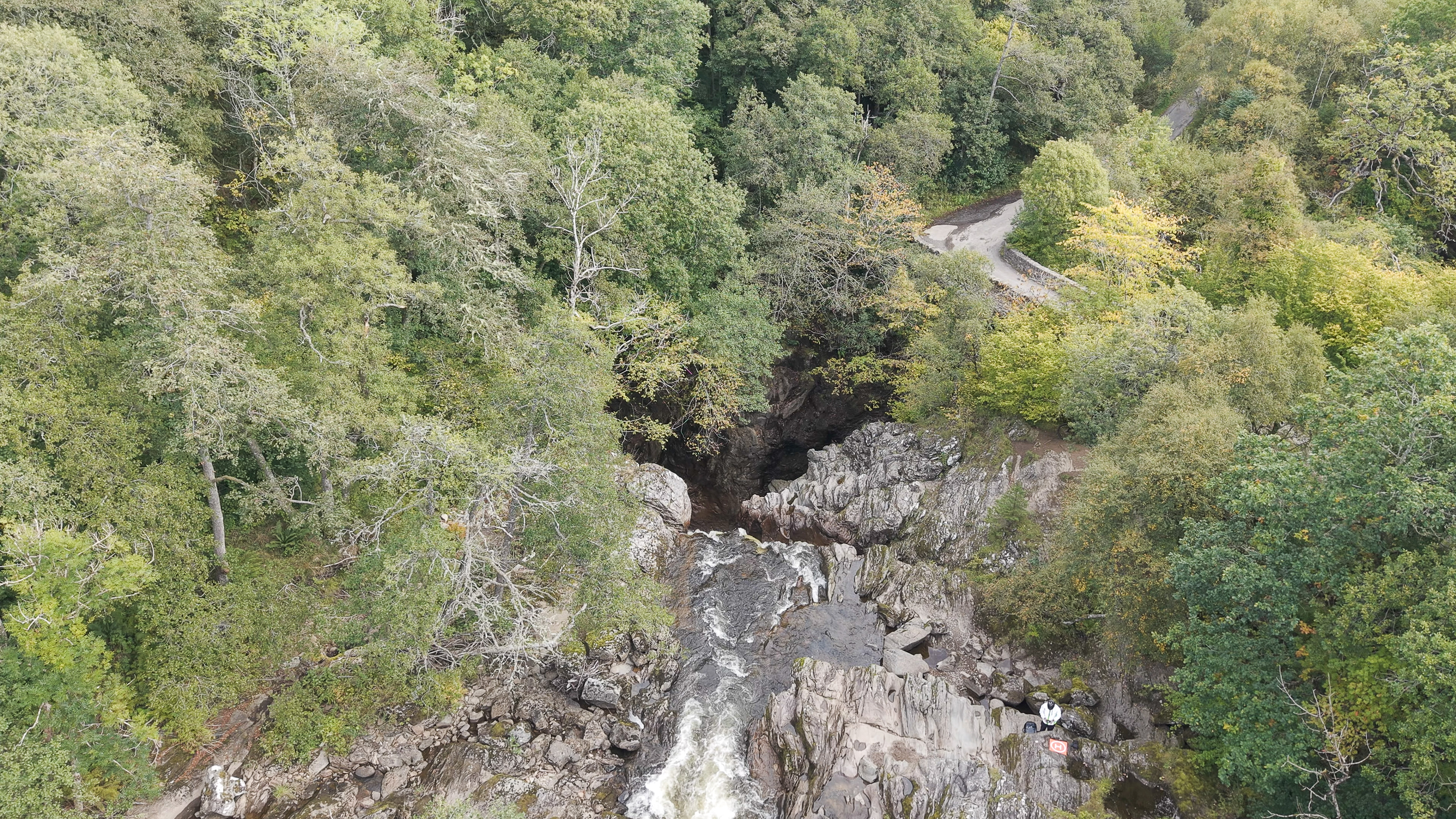 Rumbling Bridge lives up to its name — the River Braan thunders through a narrow gorge, crashing over rocks beneath a timeless stone arch. Perfect drone heaven.