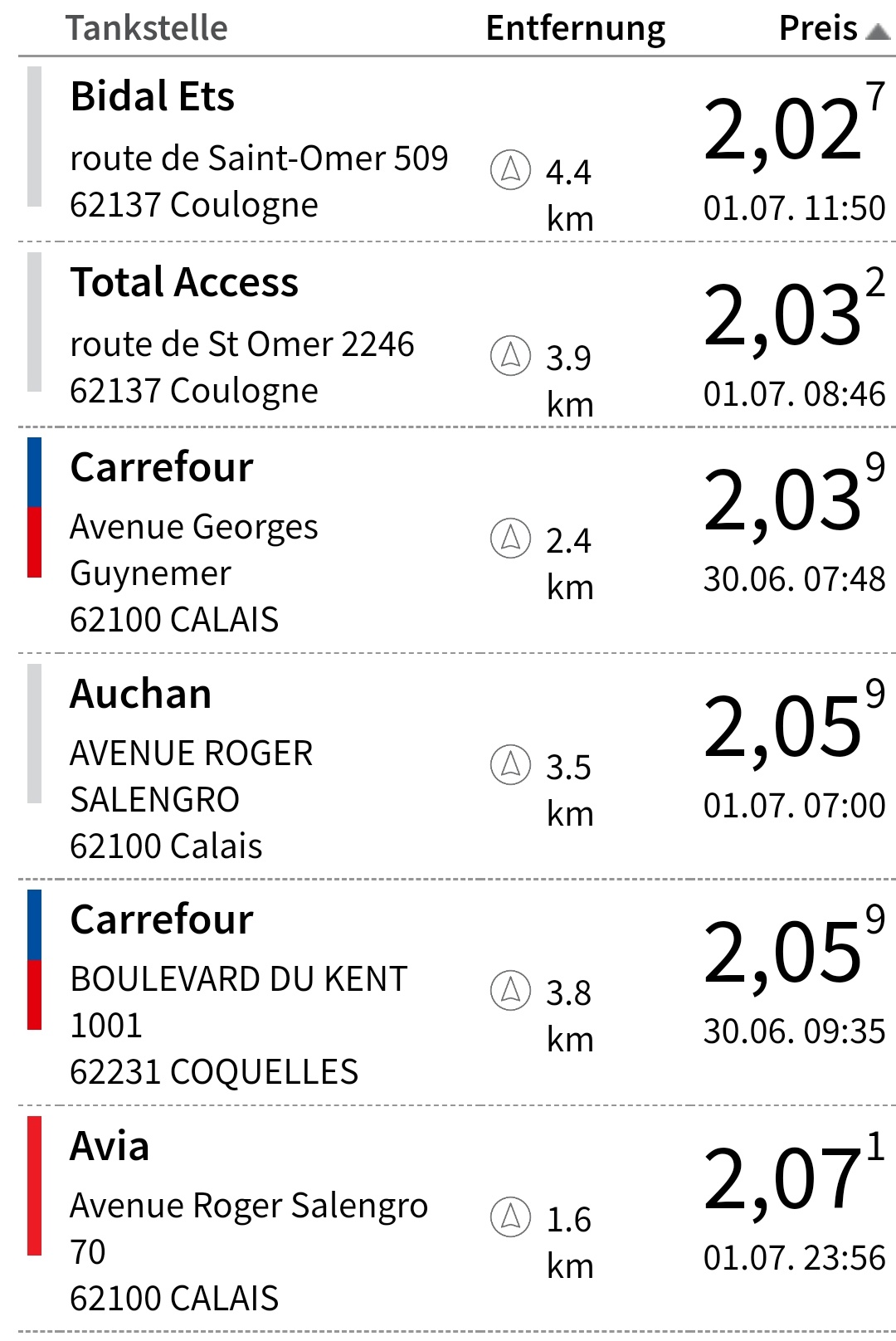 They are mainly supermarkets in Calais. Try getting those prices in the Dordogne or Charente - particularly at an independent garage.