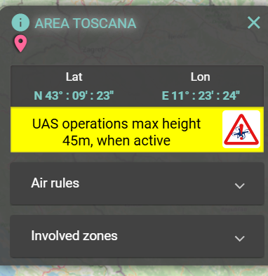 Within the geographic area, when active, UAS operations are prohibited above the indicated height. Any exceptions may be authorized by ENAC in accordance with the provisions in force contained in the ENAC ATM series circulars.