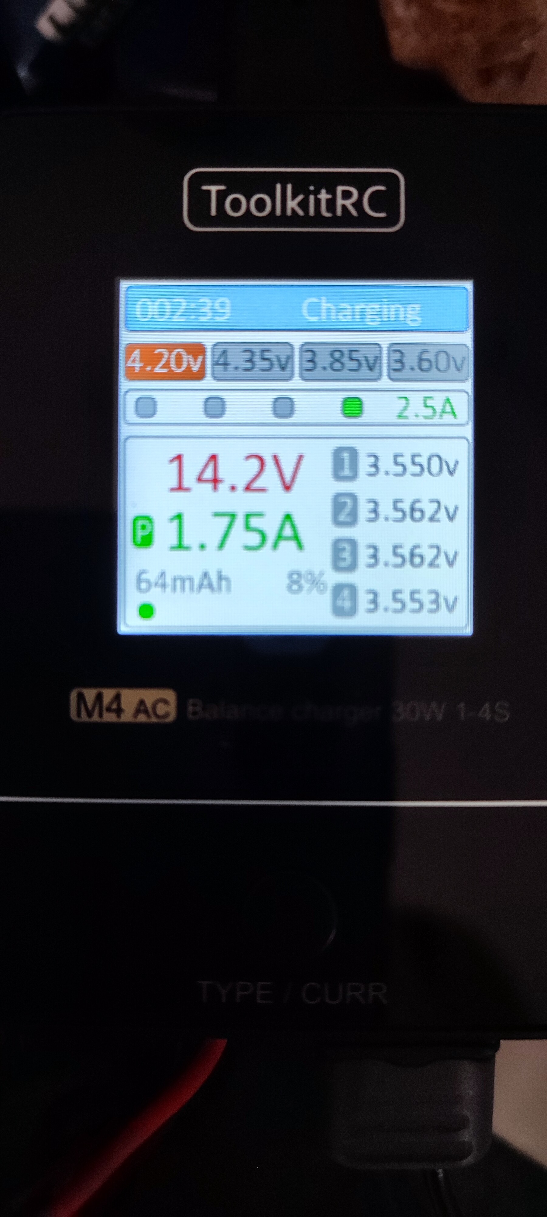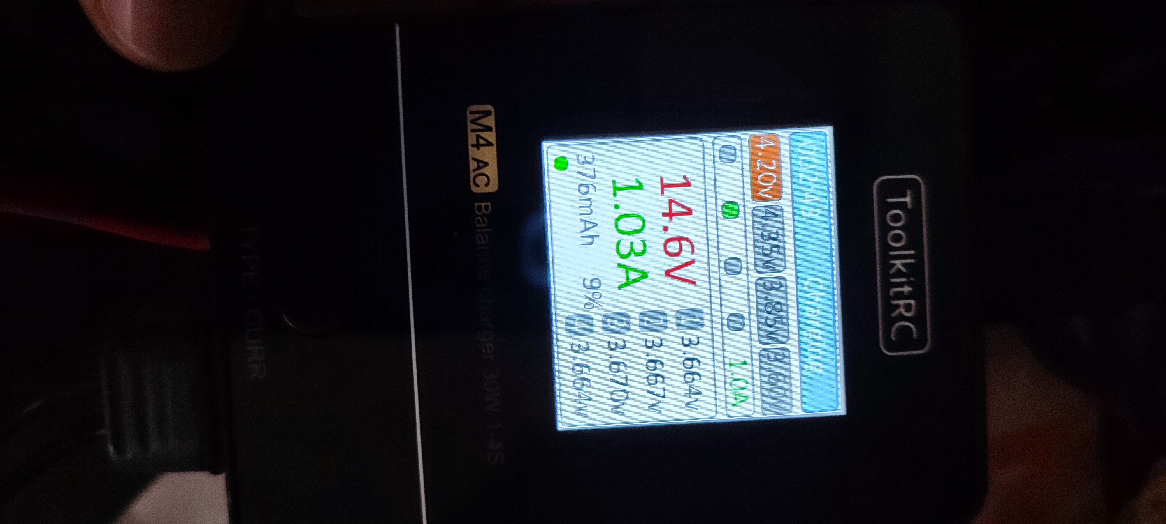 Li-ions are 4.15v. 1c charging is usually fine ![]()