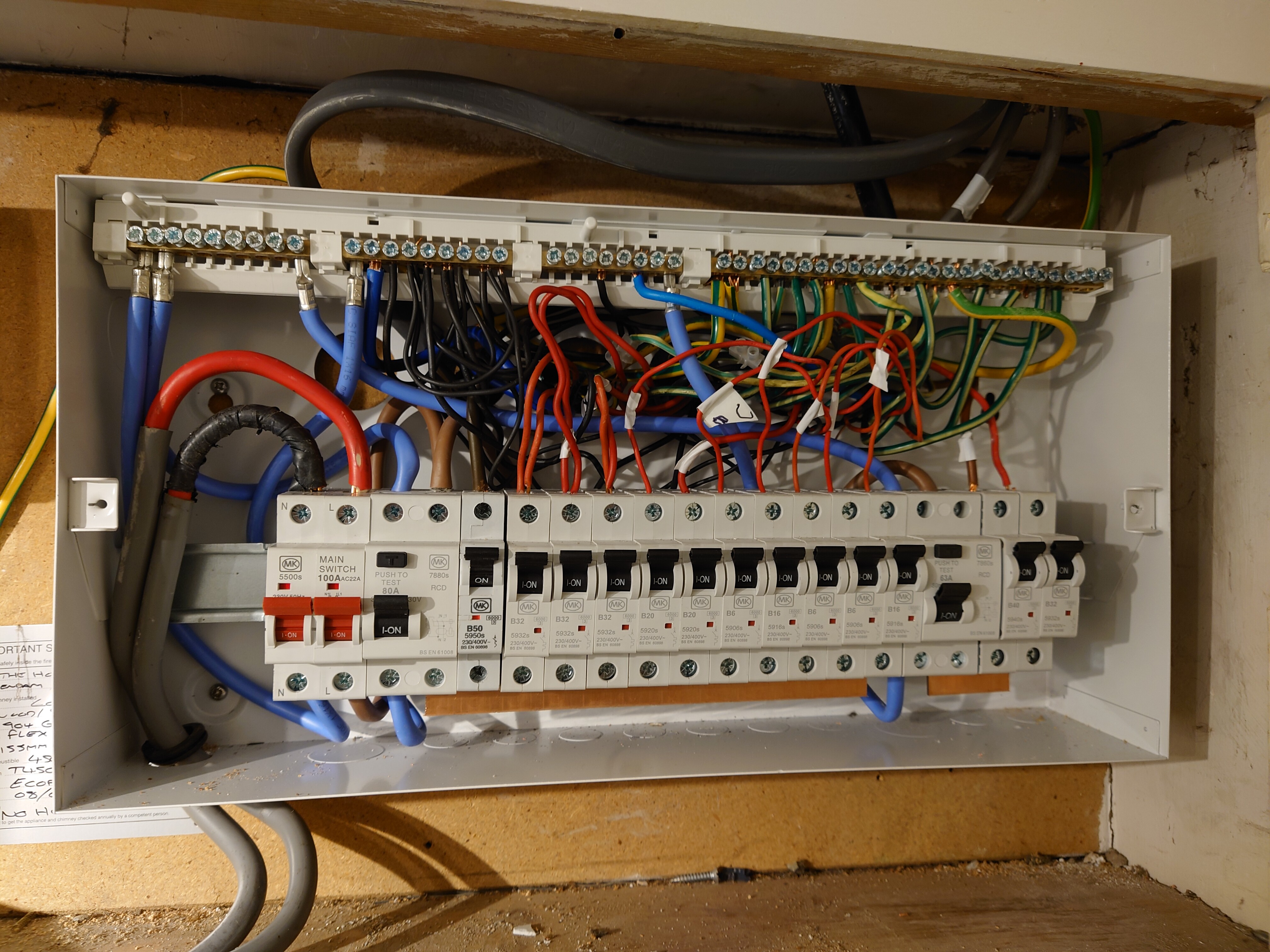 there are a couple of things I can see that I would have done differently or rather finished it off, besides the testing (grommet lower LHS, tighten all unused terminals so that the screws don’t drop out over time, trim all cables entering top of the mcbs so that there are no live cables, labeled the earth (check your earth cable size as it looks a bit small), label the equipotential bonding conductors (earth wires) to the point of entry for the water and gas supply pipelines, straightened all cables (hold the cable in one hand, and pull the cable core over a screwdriver with the other hand) and installed them with a uniform slow bend (but I’m being picky), terminate them all in order, and ensure that the neutral and earth conductors follow the same sequence (labelling all cables), check all cables with premade ferrules are fully inserted before tightening (one of the blue neutrals looks not quite terminated fully)