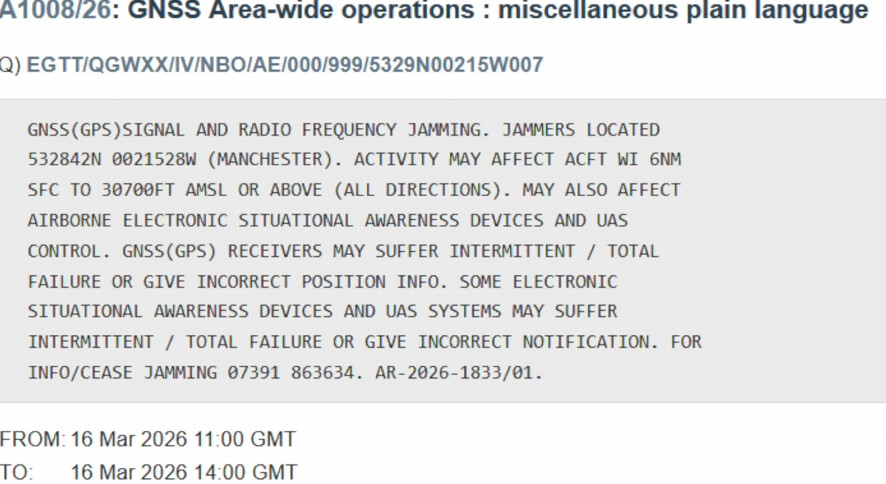 Ringway Manchester, reports on a recent NFZ in the area with a NOTAM referencing GPS and RF jamming, likely to secure airspace from drones during the King’s visit.