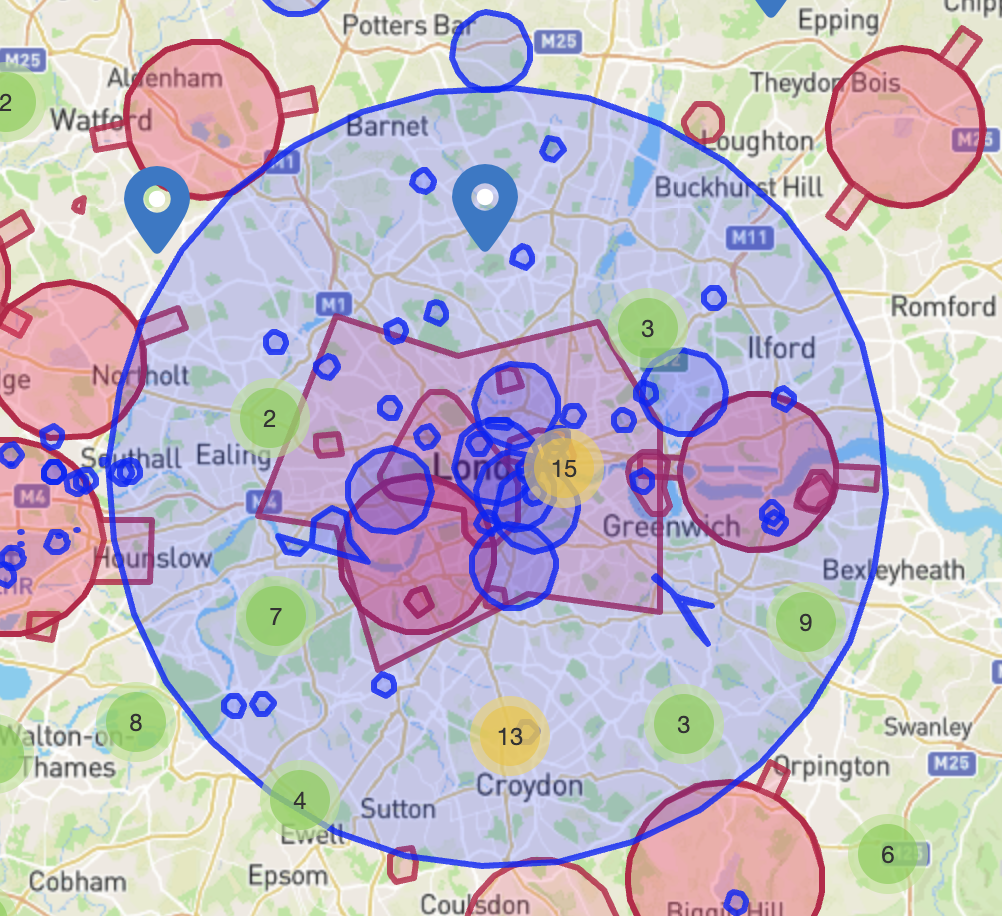 a ‘buffer’ is usually centred on the source point, but as Le60Lad said it appears to be centred on the city airport.