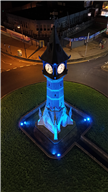 - Gabled stone base. Tower red brick banded with stone, octagonal. Square section top in stone with 4 clock faces. Pointed bronze roof. Stone base has inscription and entry.