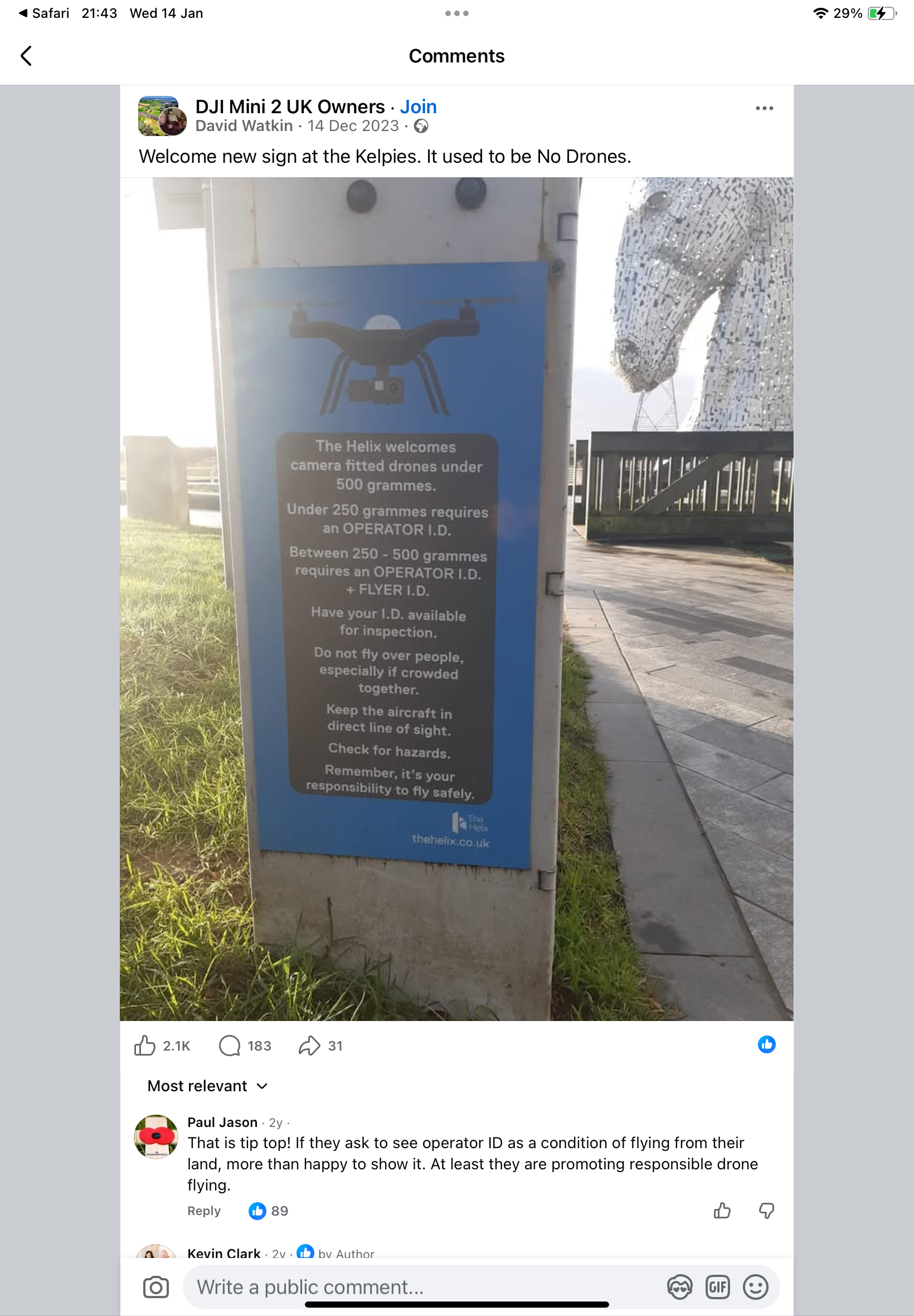 I have been to the Kelpies today, how refreshing to see a sign saying drones are welcome providing you have the appropriate documentation. Got some reasonable footage.