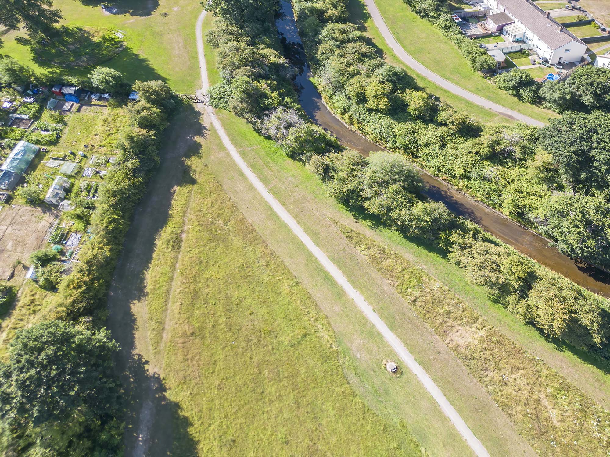 A long strip of parkland with a stream flowing through it.