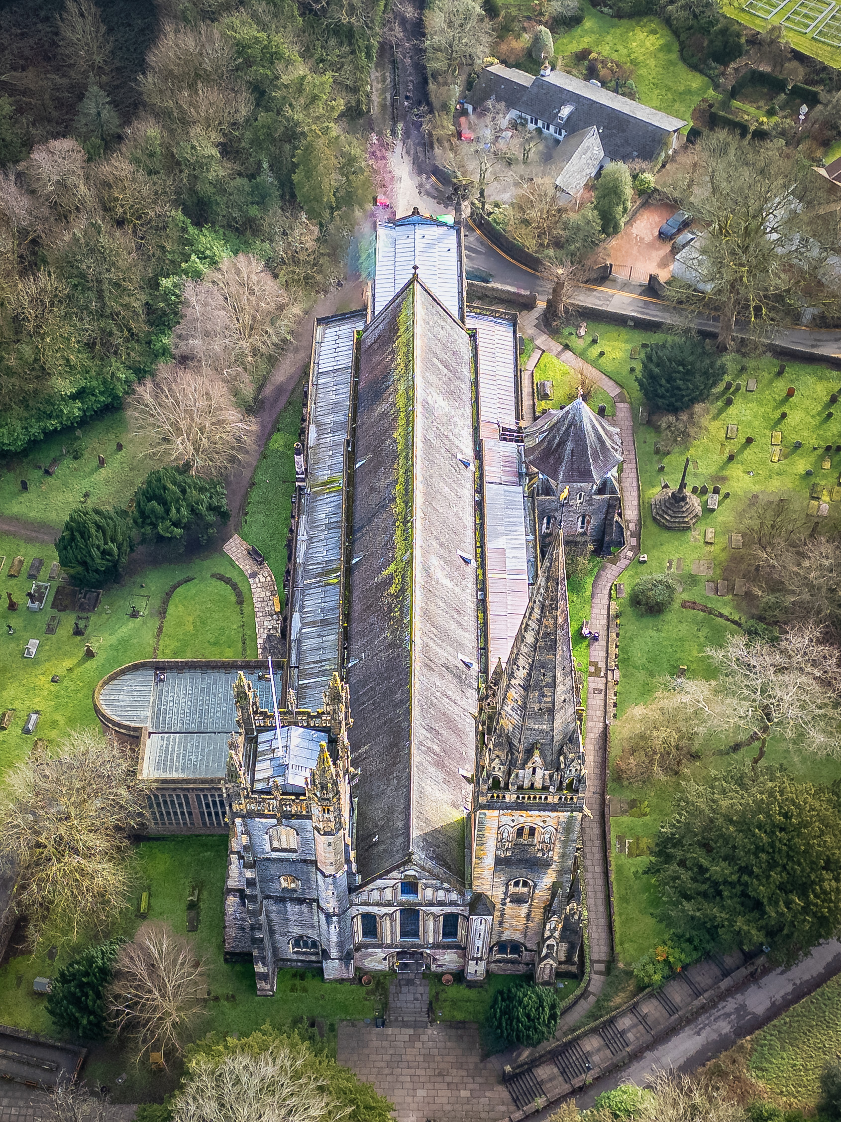 The top-down view highlights the cathedral’s unique "long-church" floor plan, lacking the traditional transepts (the "arms" of a cross). You can clearly see the moss-covered central nave and the Lady Chapel extending to the east.