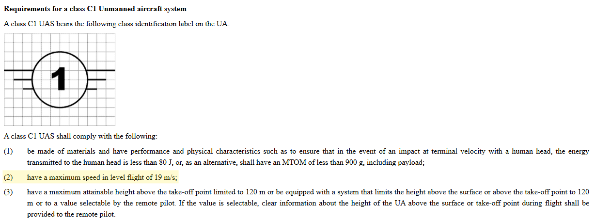 Per the C1 requirements, it should now be limited to 19 m/s. The legislation says this for C1-marked drones: