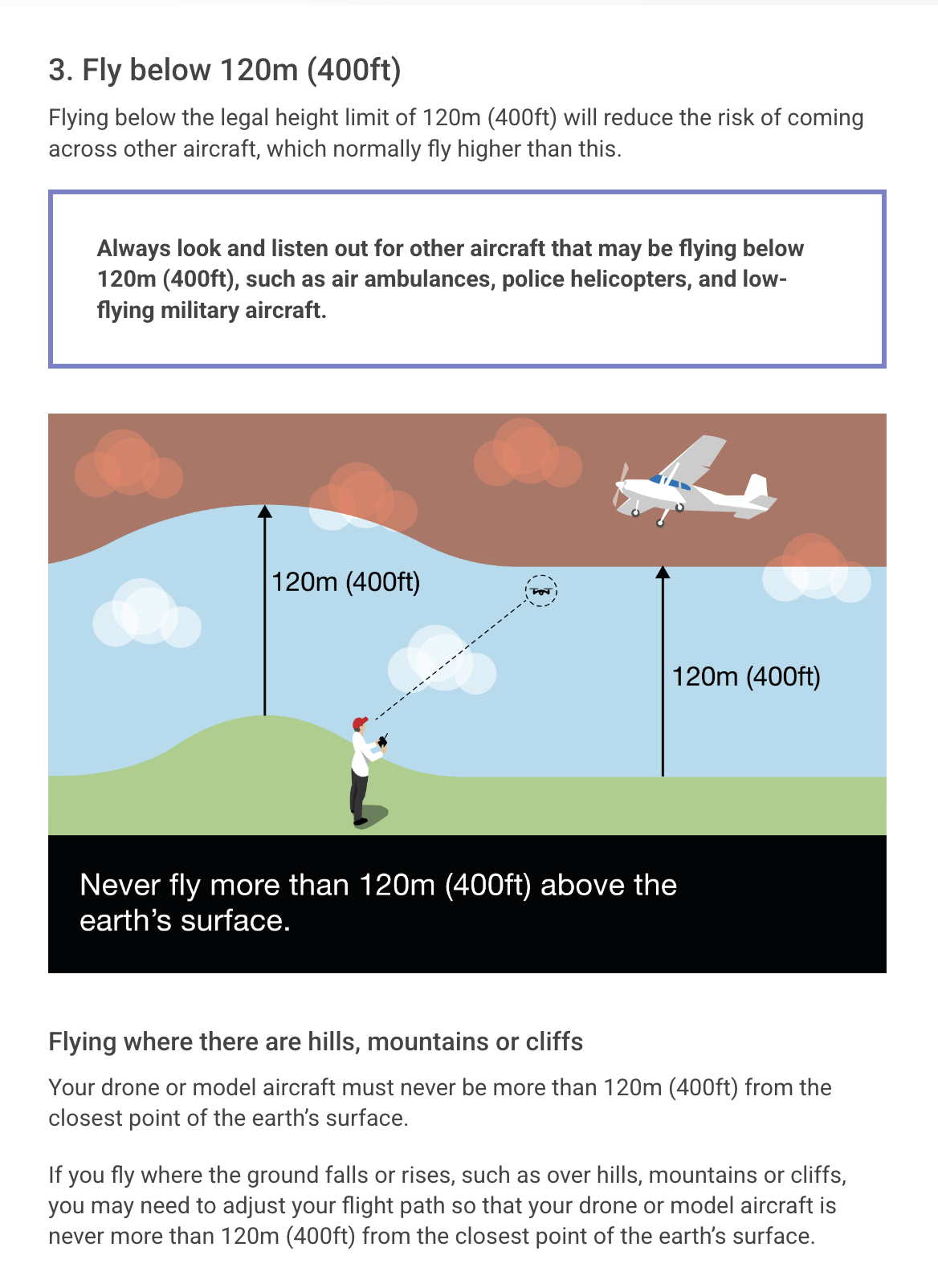 This is my understanding of the situation. The previous rule was that drones were limited in height to 400’/120m from the nearest point on the earth’s surface, and in the case of flying from the top of a vertical 1000’ cliff, you could for example fly vertically upwards for 100’, then horizontally for 300’ away from the cliff; you would be 1,100’ AGL, but ‘legal’ because you are only a little over 300’ away from the nearest point on the ground.