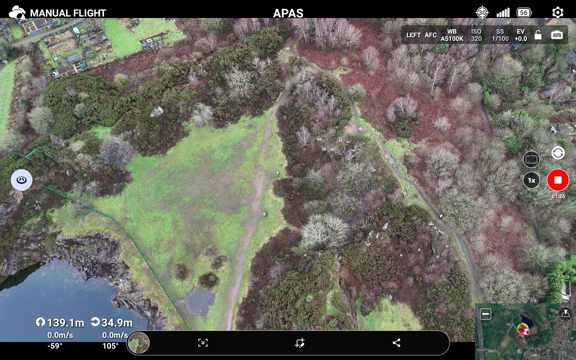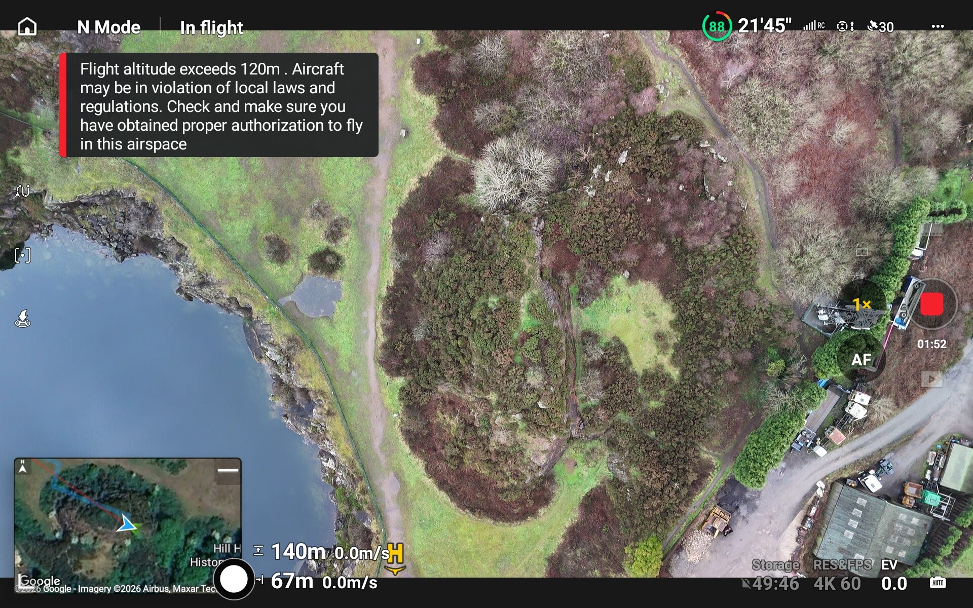 I now have two workrounds to the height conundrum on my Mini 4 Pro; the Drone Tweaks FCC version of the current DJI Fly app, or using Litchi Pilot. Both run on my Samsung tablet, so to test them I found a quarry with a rock outcrop 20m above the TOAL point on the quarry floor. I positioned the drone over the outcrop and increased its height to 140 metres. No problem in either case, as shown below: