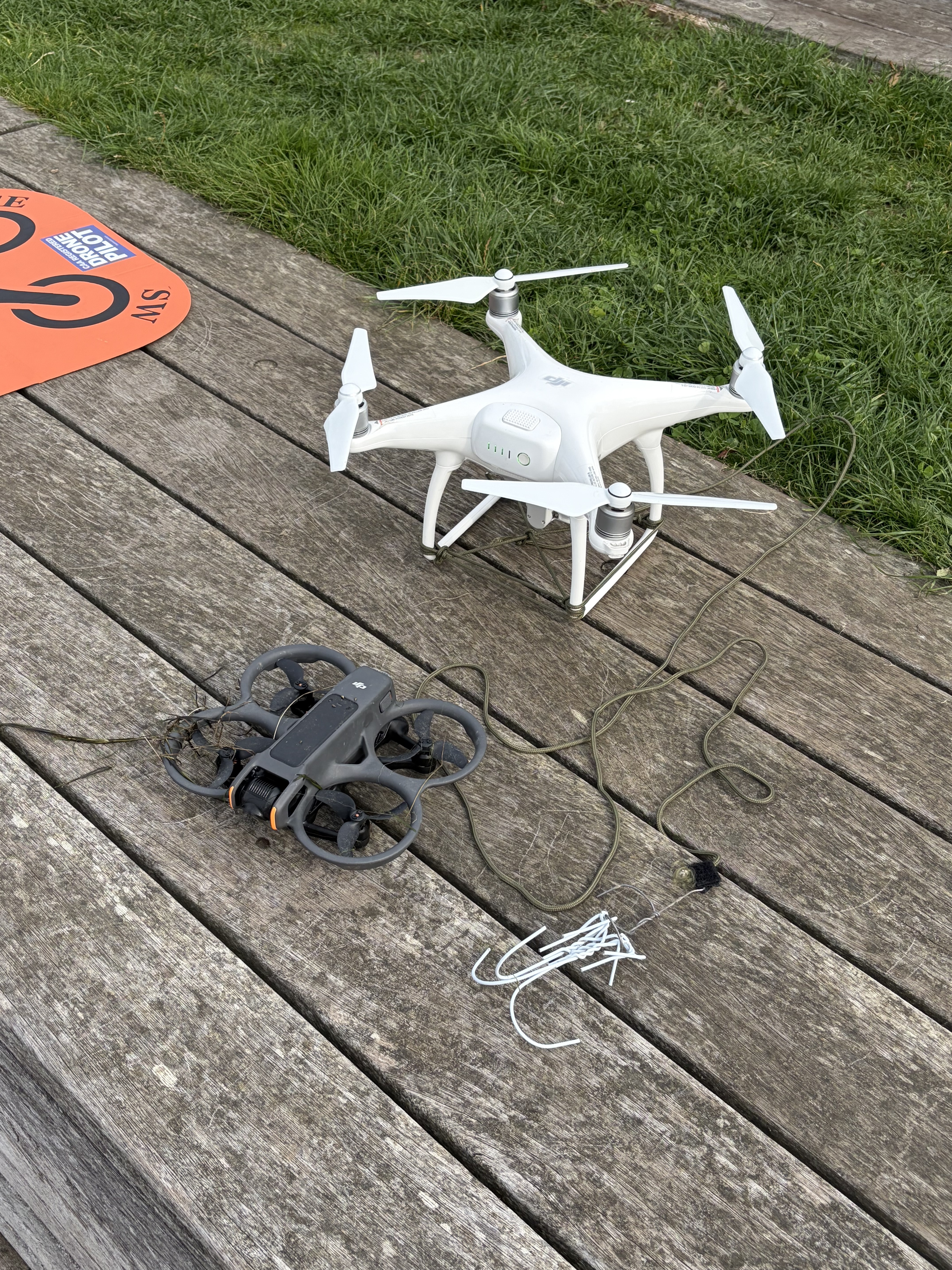 Raw footage (unedited and no soundtrack) of Nik @Nik469 rescuing his Avata using his Phantom 4 and a grappling hook assembled by Rob @macspite from the seabed at low tide. The Avata made an ‘unplanned landing’ during the regional Meet Up at Alexandra Park on Sunday 28th September 2025 with the actual splashdown witnessed by Steve @stephen1