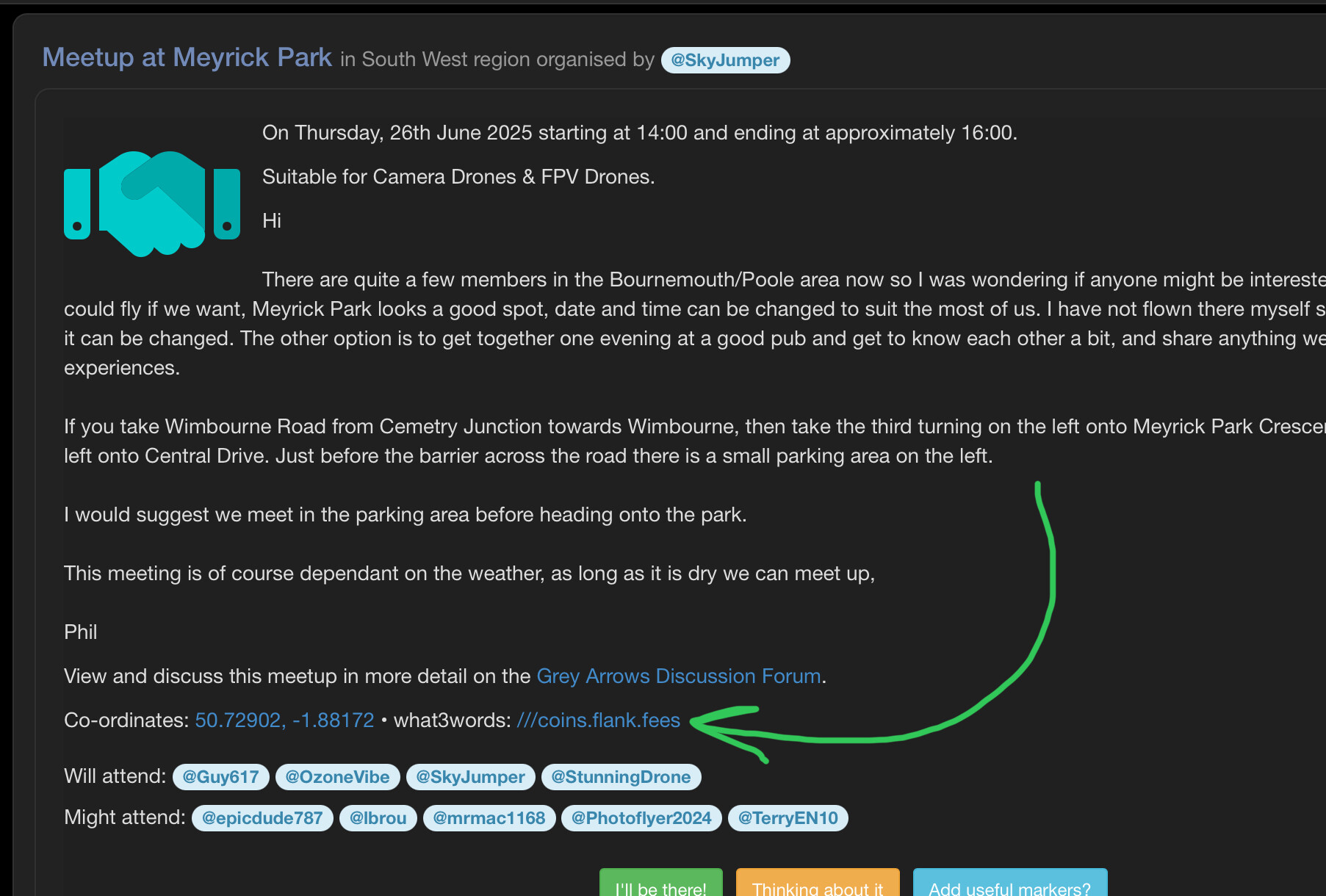 Ahhhh right, in which case you might want to edit your meetup and move the marker to where you’ll actually be flying from ![]()