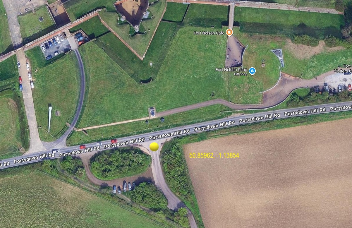 I would like to offer some info now based purely on Google Maps. On the south side of the Portsdown Hill Rd, opposite the “Royal Armouries: Fort Nelson” site there may be a location where we can park and operate from. (Lat/Long Provided) This is one of two entrances giving access to the Fort Nelson Alternative Parking location. There is a sign stating the Gates will be closed at 16h30. If this is true, then I think there may be sufficient space to park a few cars at the entrance (4-6 maybe?) possibly more if we park efficiently etc.