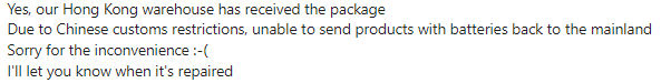 So it arrived in Hong Kong about 4 weeks ago… unfortunately it needed to be in mainland China to be repaired. It could not be shipped to the mainland though as it has a battery in it. (a really small one, ffs)