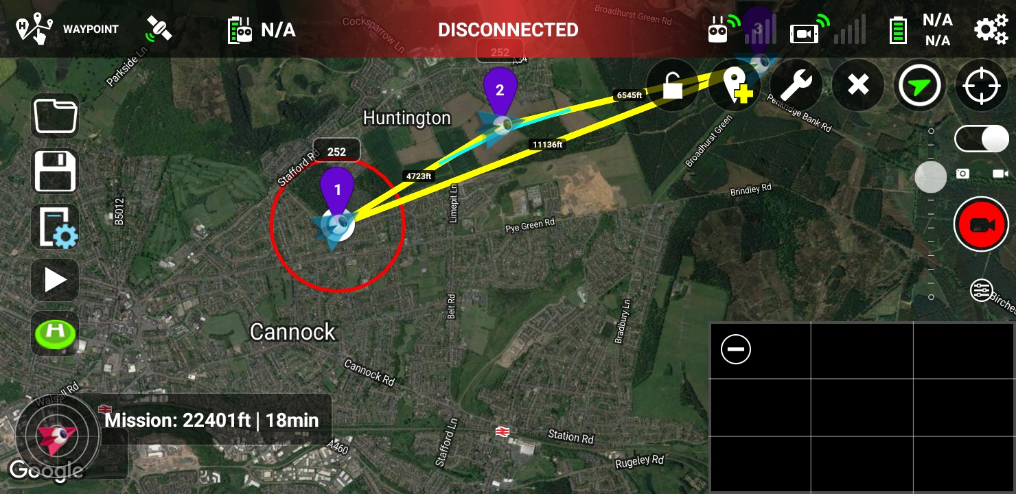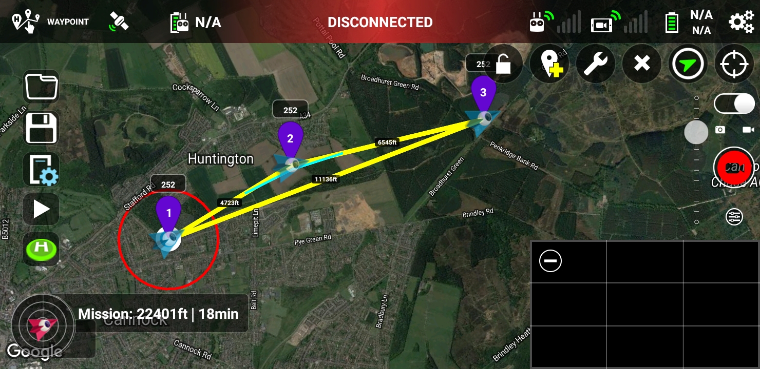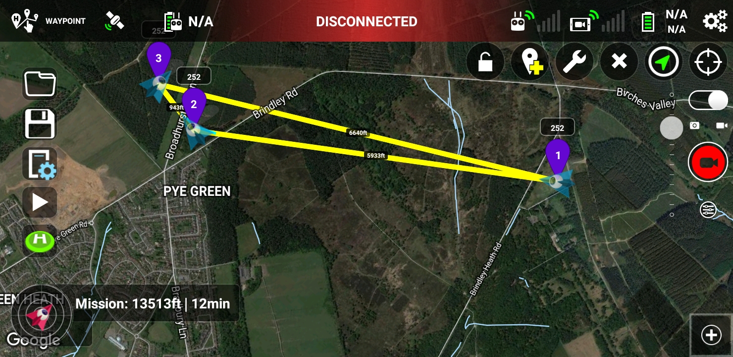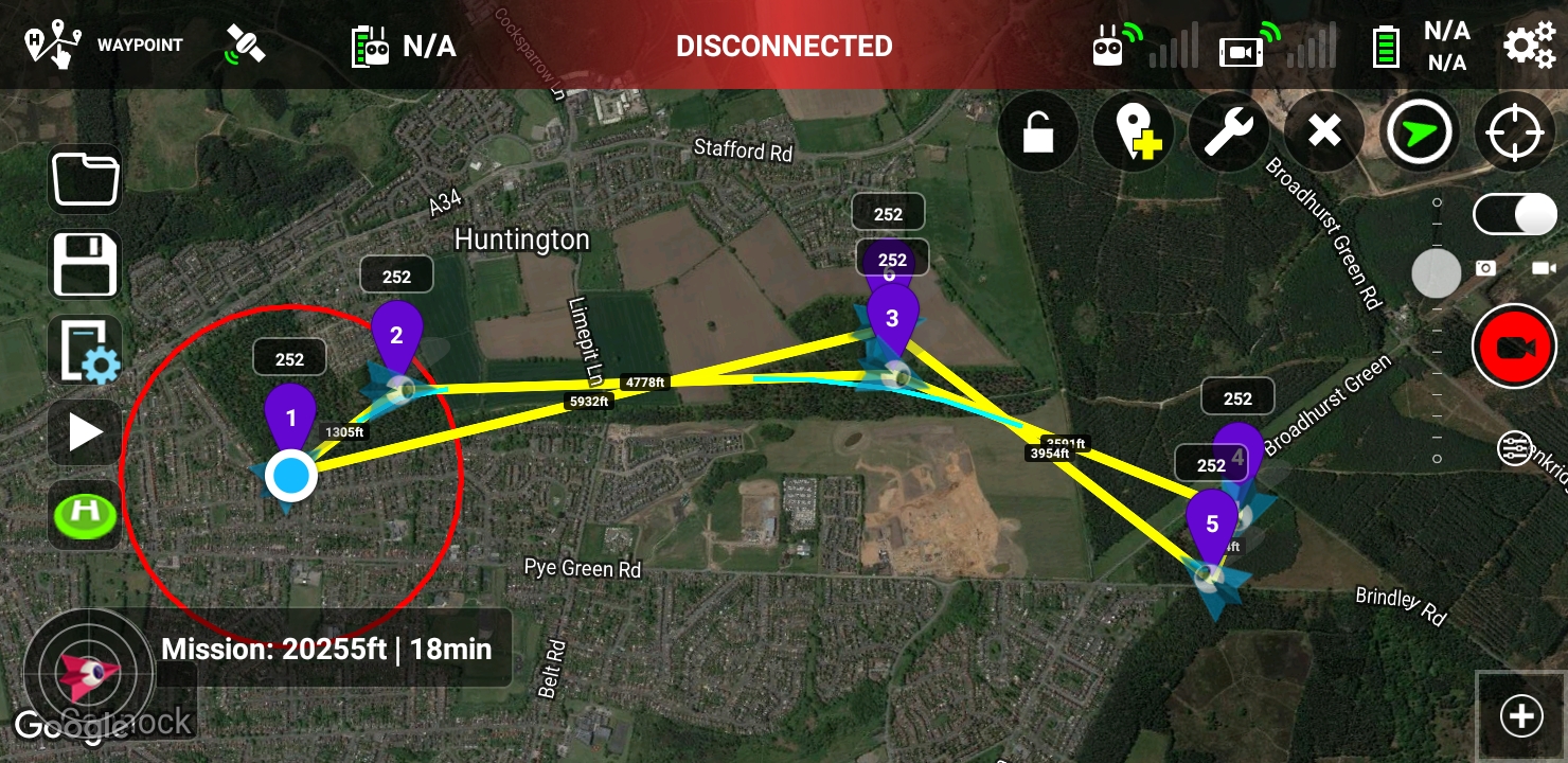 Make sure you identify some suitable early landing spots in case you need to abort the flight. Litchi should abort early automatically if it thinks it can’t get back home but it would be good to have an emergency plan and a mate with a car to retrieve it for you if needed