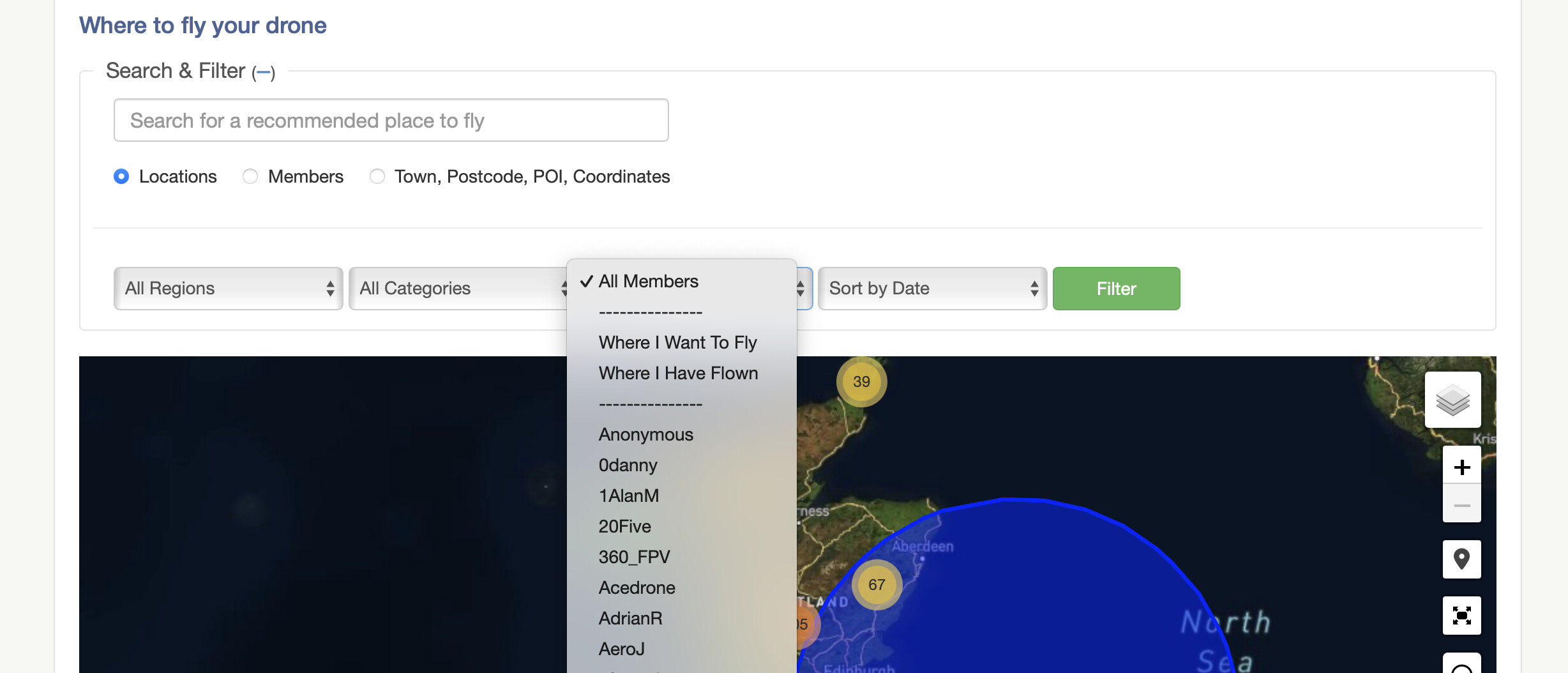 When you go in to the map, you can then select the filter for “Where I want to fly” and the map will show you them all: