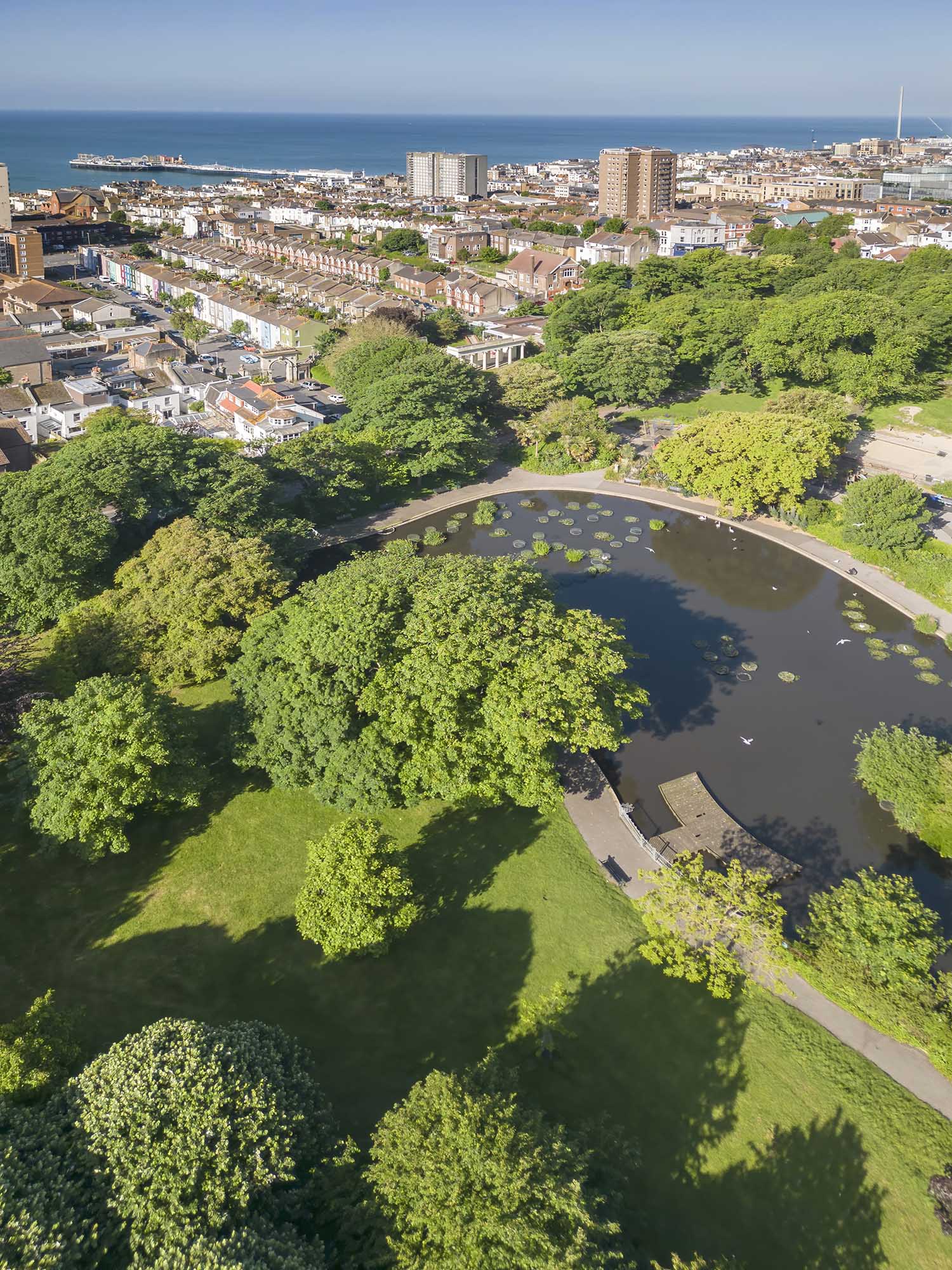 A local park in Brighton with lots of space, a lake, and distant views of Brighton pier