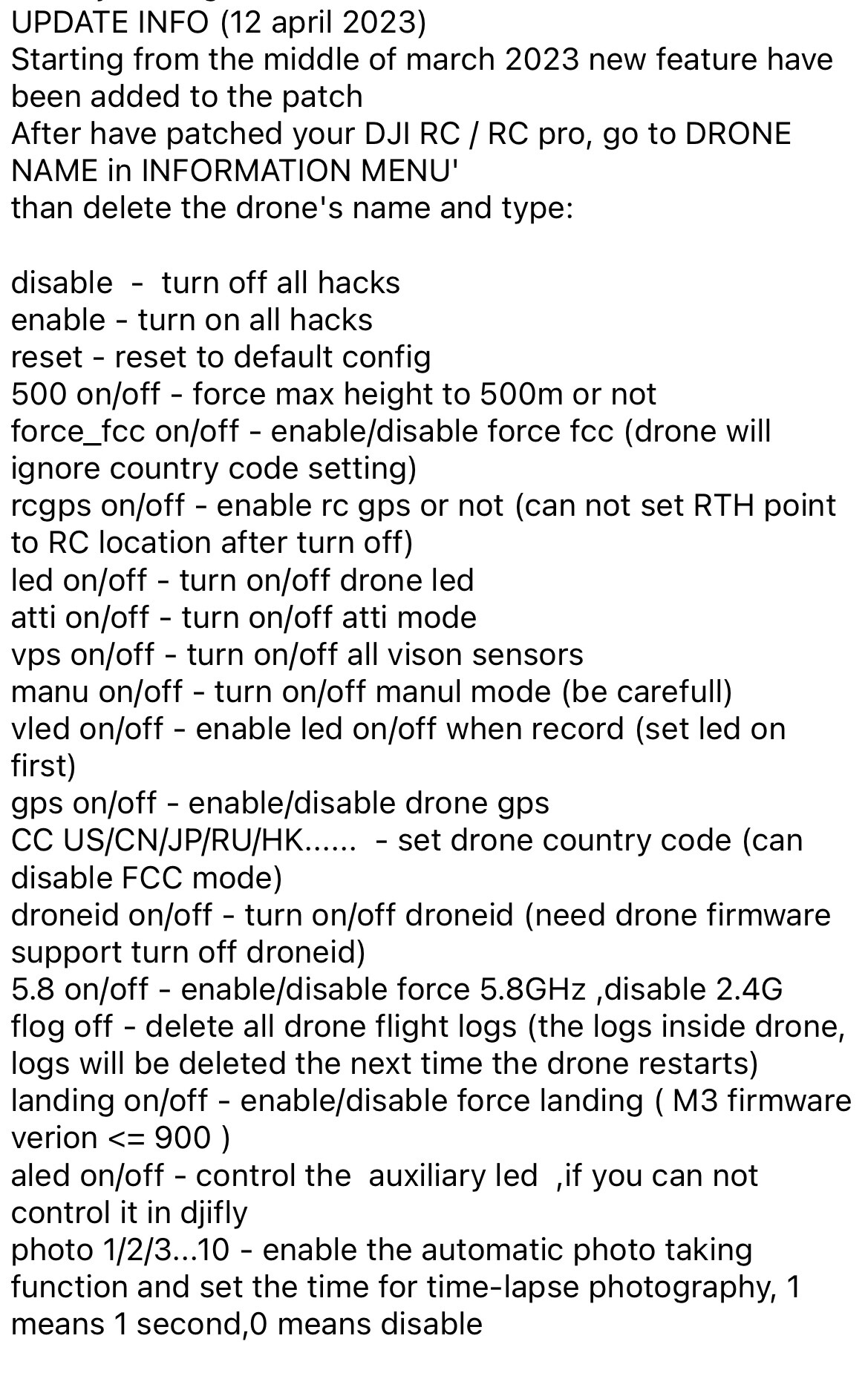 CC US/CN/JP/RU/HK⦠- set drone country code (can disable FCC mode)