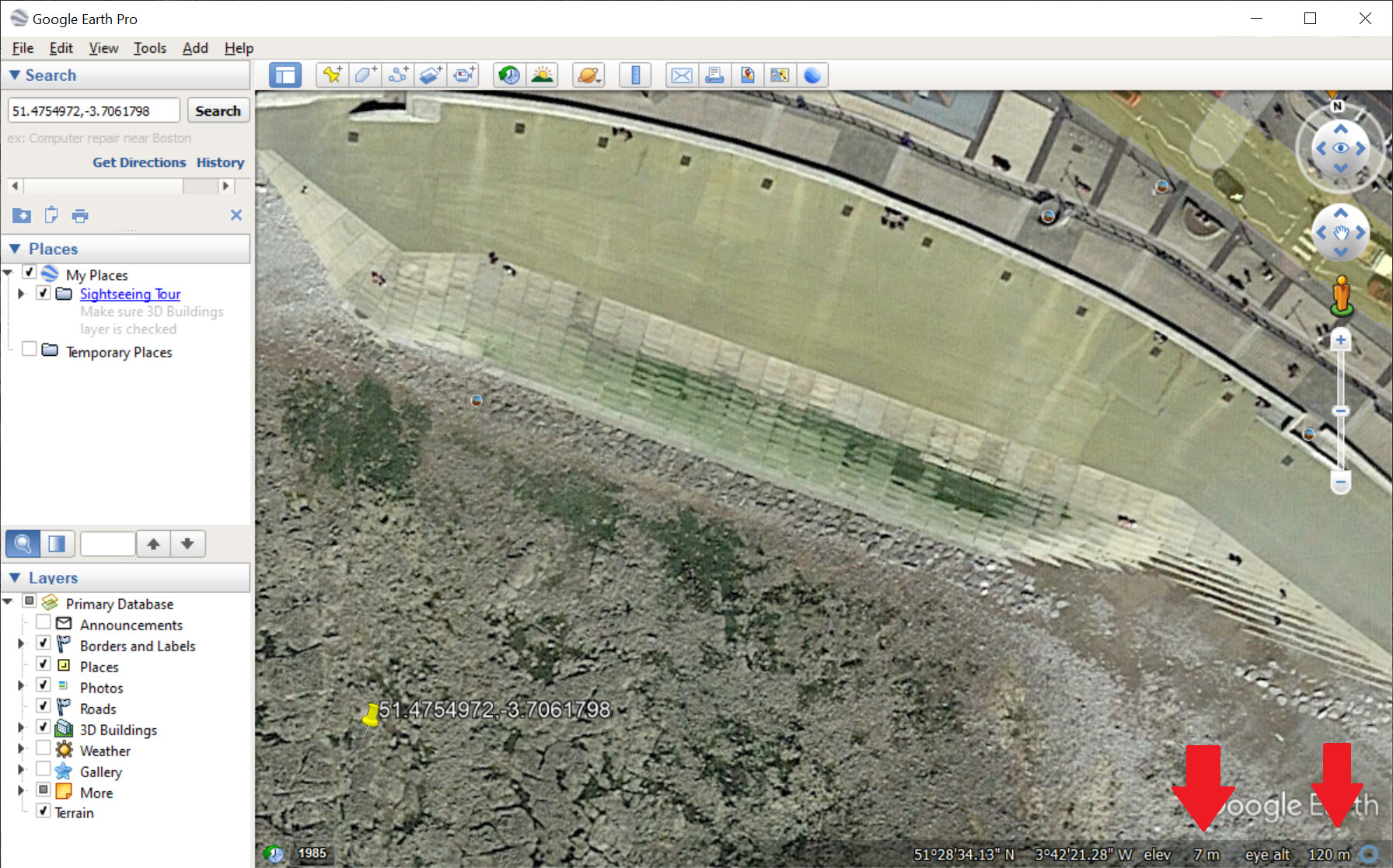 I’m sure my height wasn’t anywhere near 400’ but I suspect it was higher than 40m. Here is another image showing the steps and surrounding seafront, the metadata shows the altitude as 82 somethings (meters/feet or maybe bananas?) Not sure how reliable this metadata info is based on my previous underwater shot