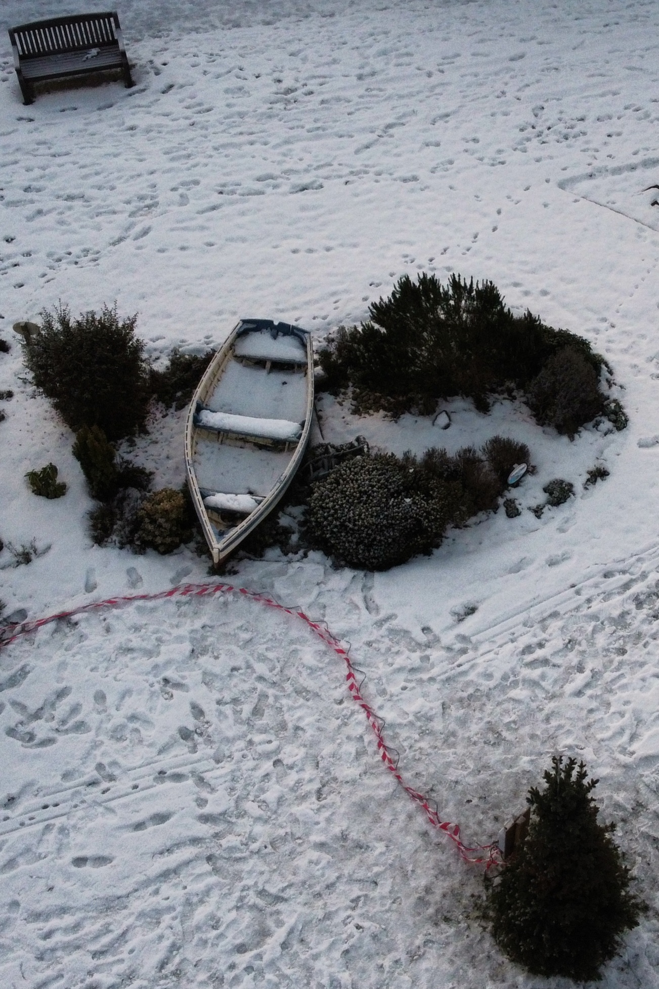 Boat in snowy flowerbed. Less abstract, more odd. Looks better in the spring. Crimbo tree lights went off as I was taking pic.