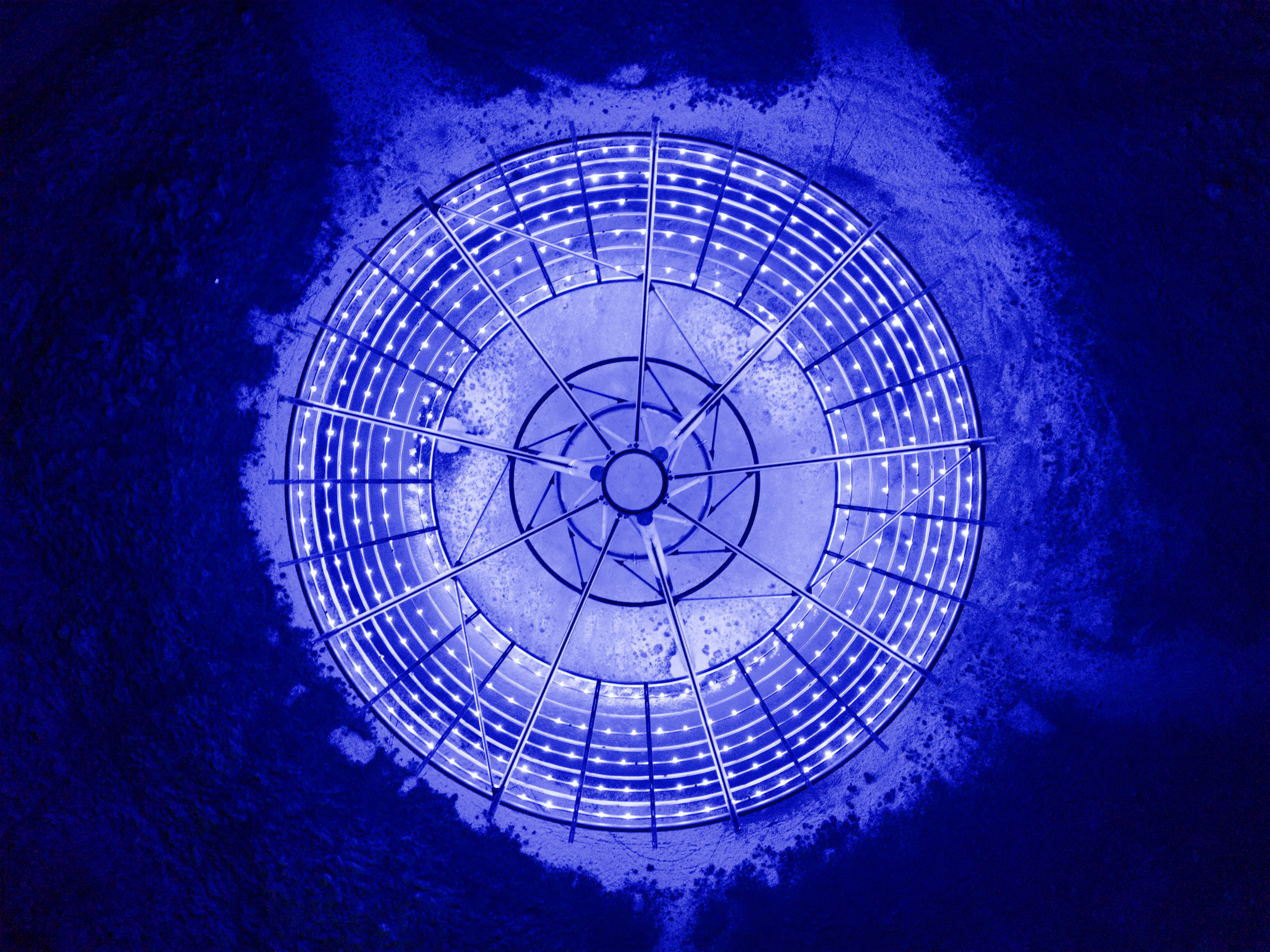 Monumental, 18m-diameter steel artwork, installed in 2007 & illuminated in blue after dark.