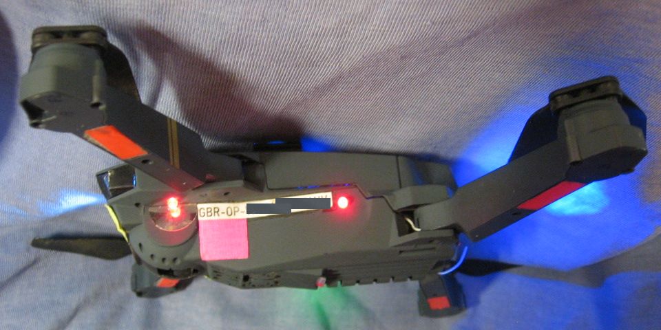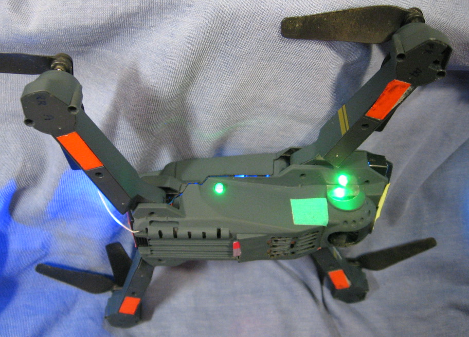 So I have applied strips of different coloured fluorescent tape on each side of my drone, and fitted 2 red and green navigation LEDs on each side, pointing both down and sideways.