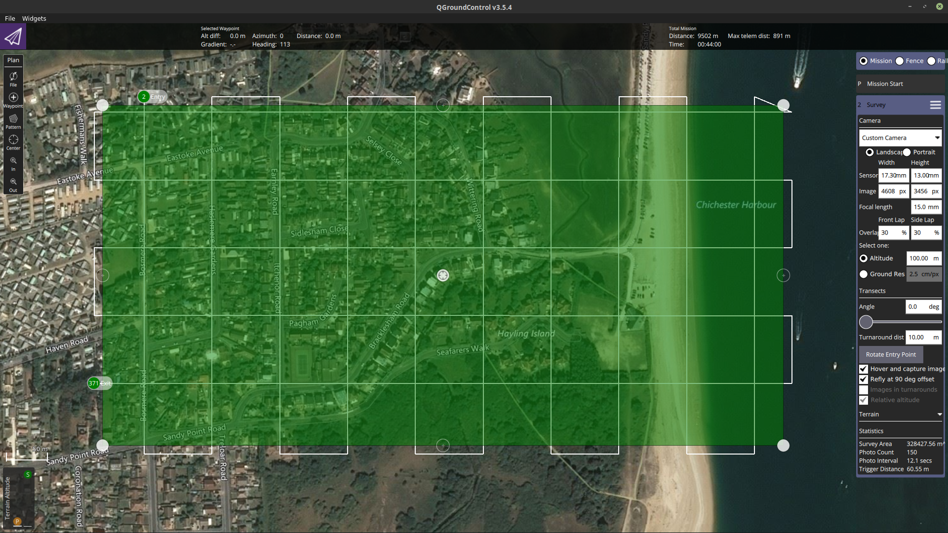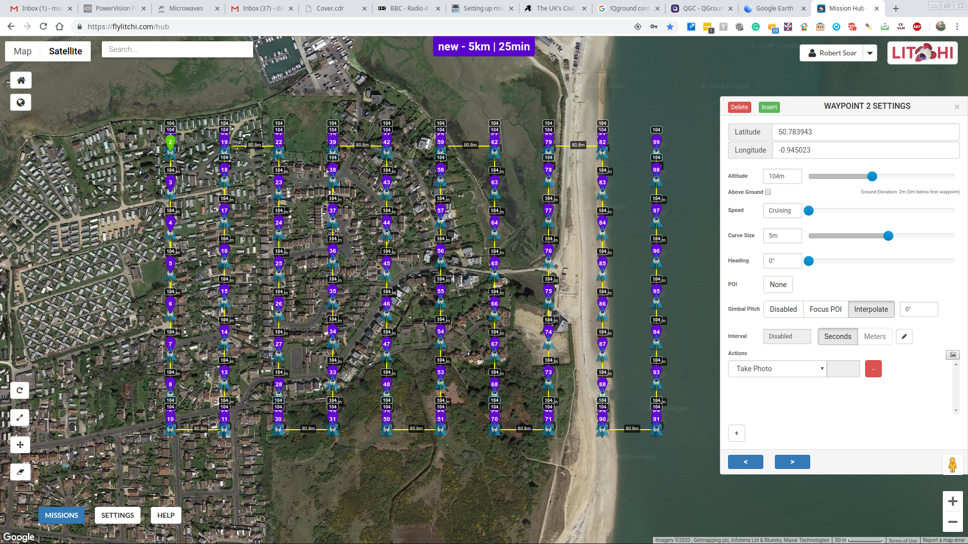 But - if I save the mission as a *.kml file I can view it in Google Earth and, more importantly, import it into the Litchi Mission planner. Tick the box for the take photo at waypoint option and you now have a search pattern with a photo taken at each waypoint. The only thing I’ve not found yet is a means to set default gimbal angle to minus ninety degrees.